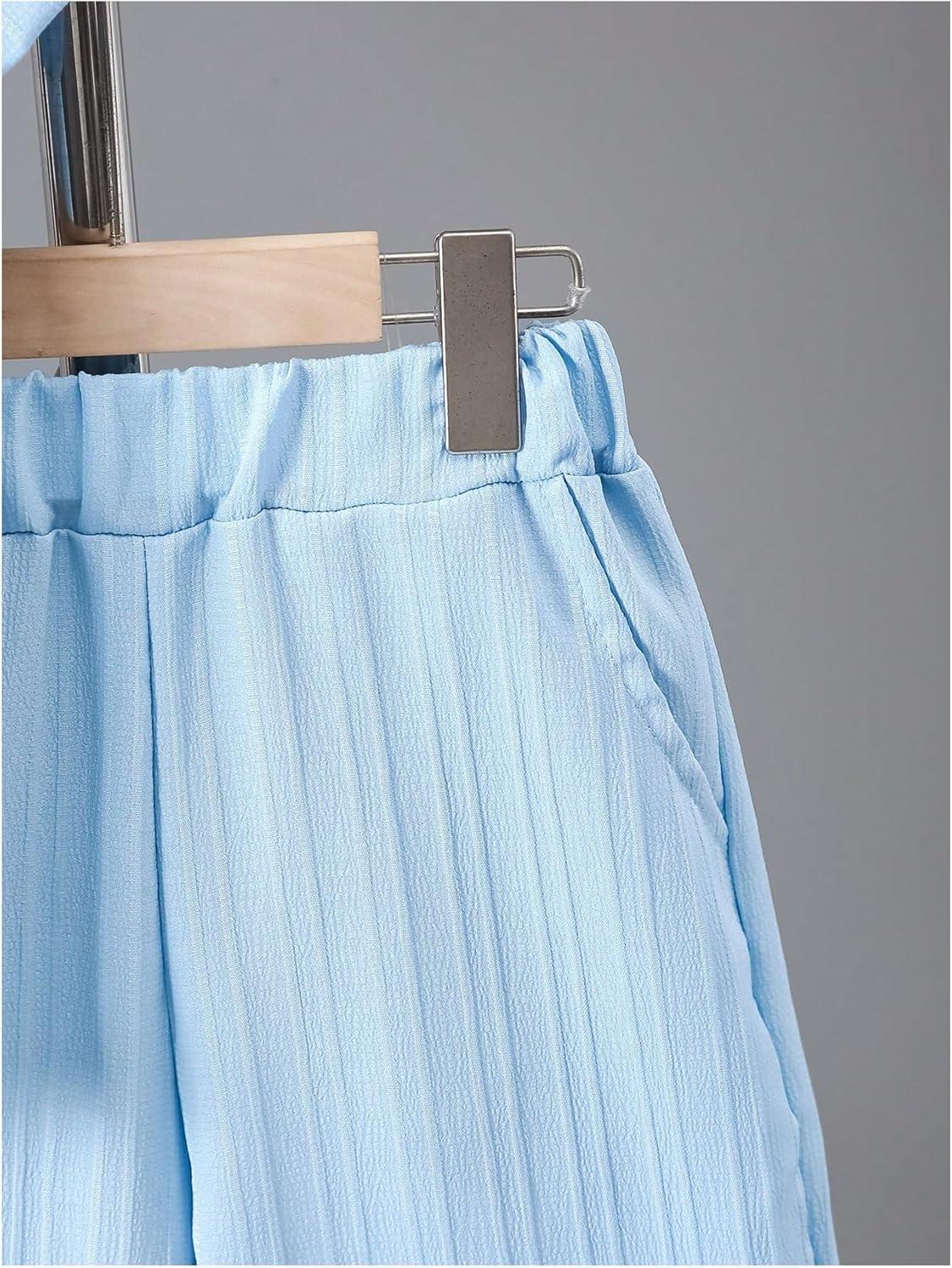 Boy's 2 Piece Beach Vacation Textured Linen Outfit Short Sleeve Button Down Shirt Top and Shorts Summer Set(Solid Blue)