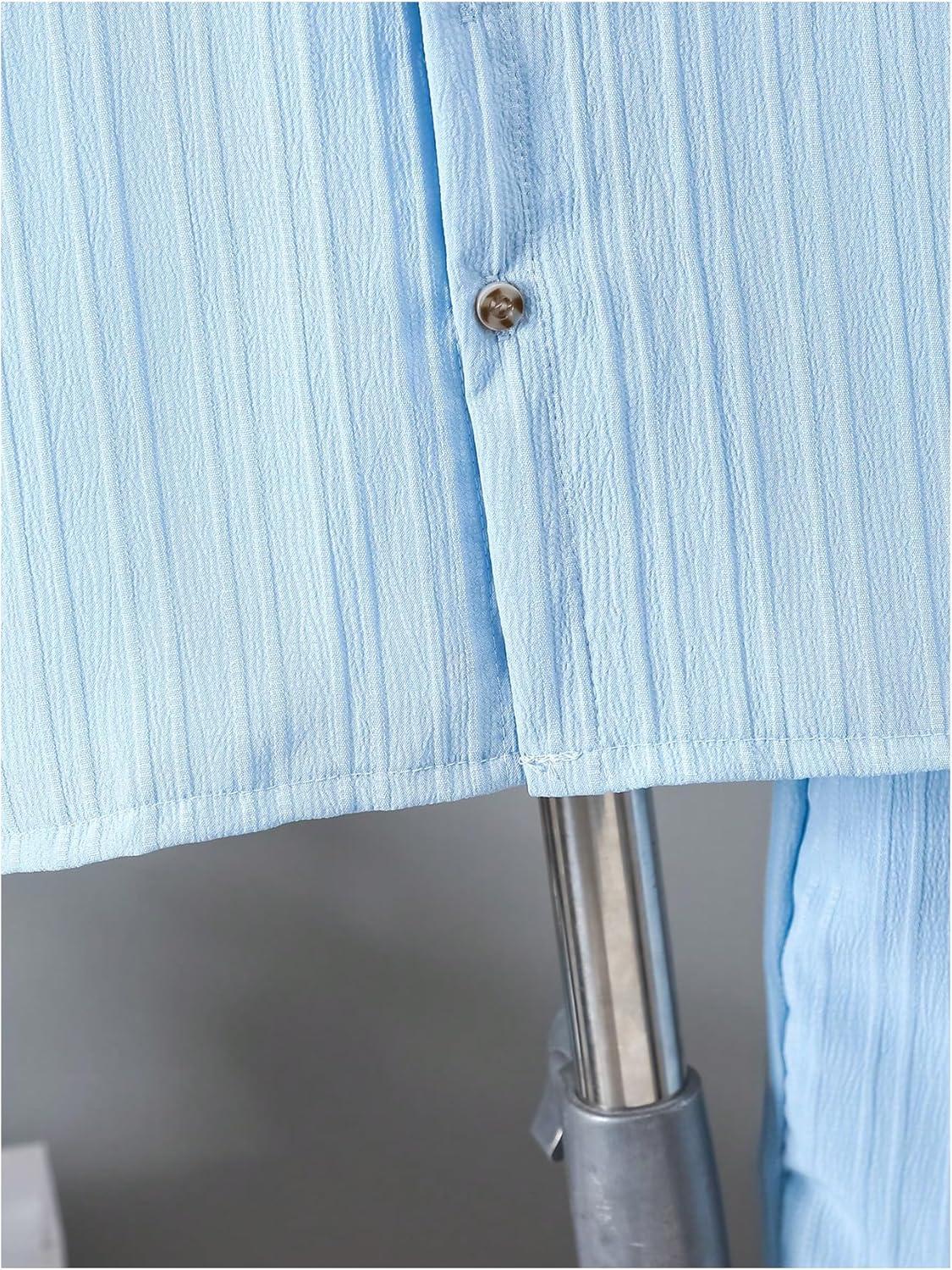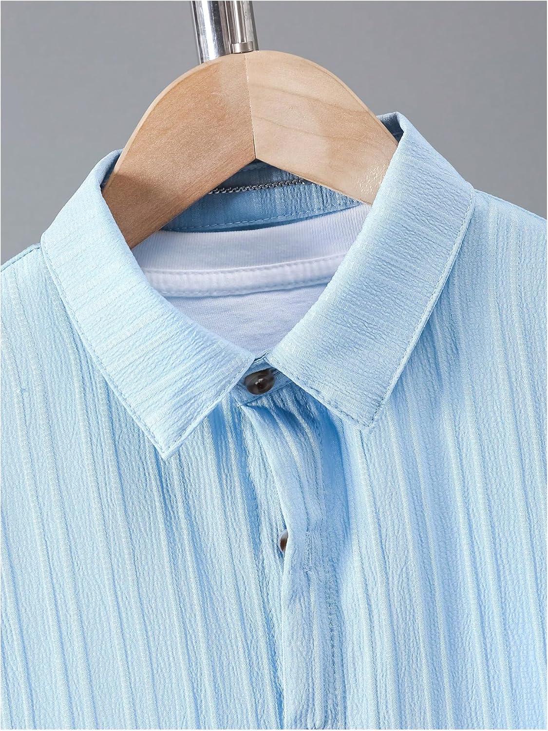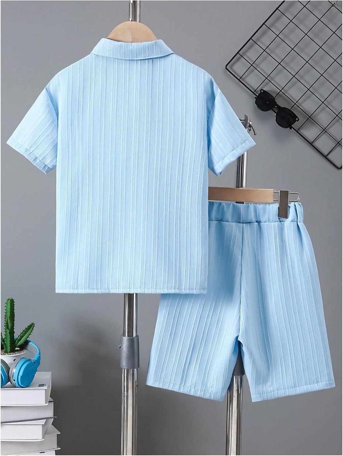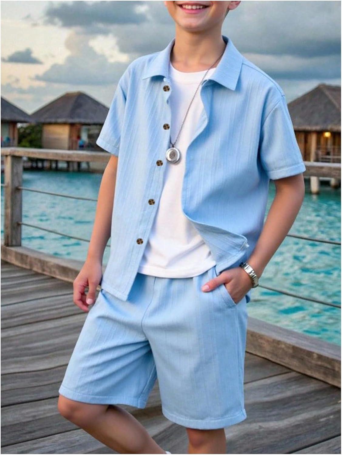 Boy’s 2 Piece Beach Vacation Textured Linen Outfit Short Sleeve Button Down Shirt Top and Shorts Summer Set(Solid Blue)