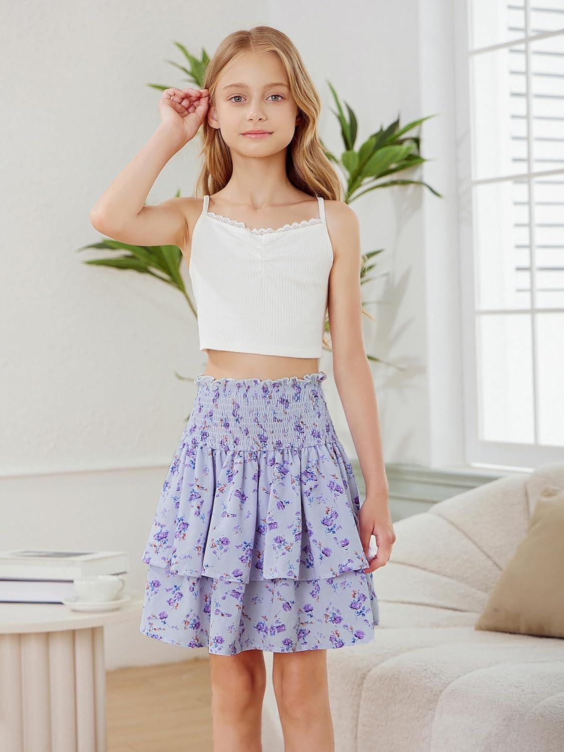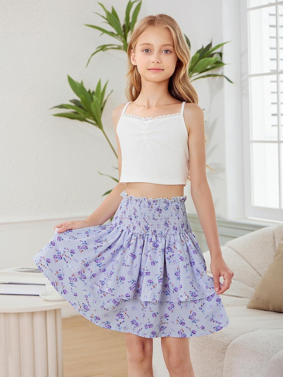 Girl’s 2 Piece Outfits Lace Ruched Camisole Tops and Shirred High Waisted Layered Floral Skirts Set(Purple and White)