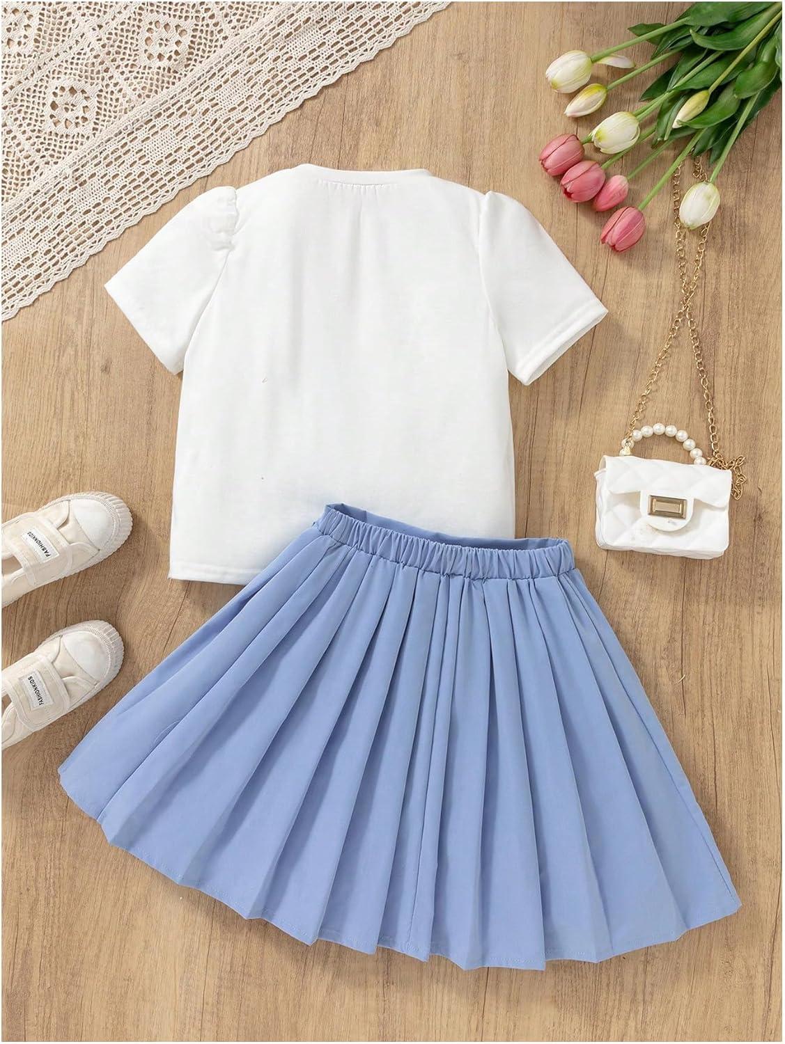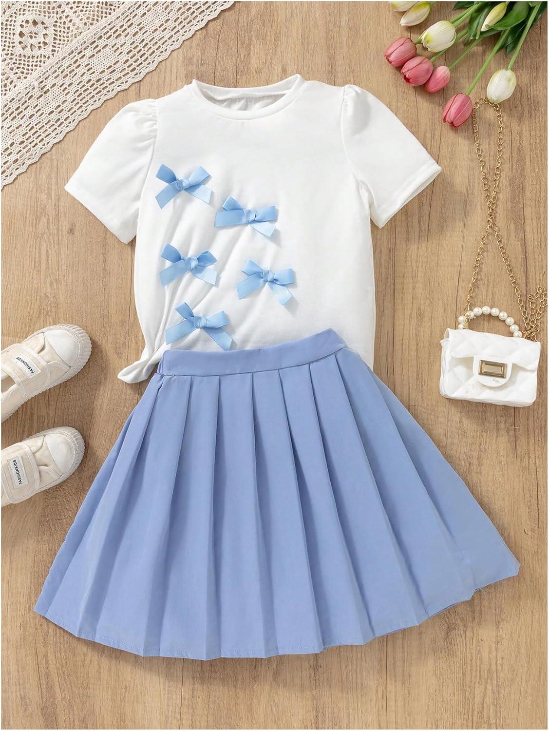 Girl’s 2 Piece Preppy Summer Outfits 3D Bowknot T Shirt and Mini Pleated Skirts Clothing Set(Blue)