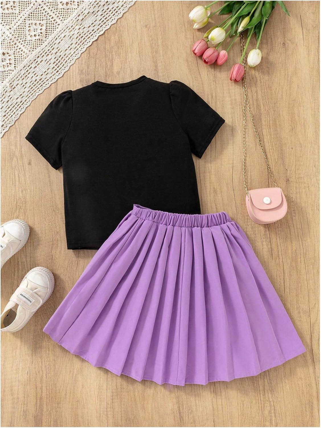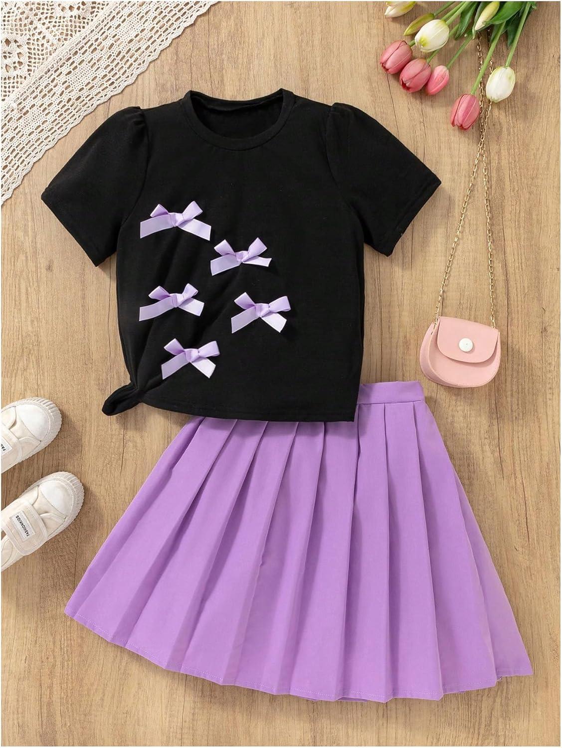 Girl’s 2 Piece Preppy Summer Outfits 3D Bowknot T Shirt and Mini Pleated Skirts Clothing Set(Purple)