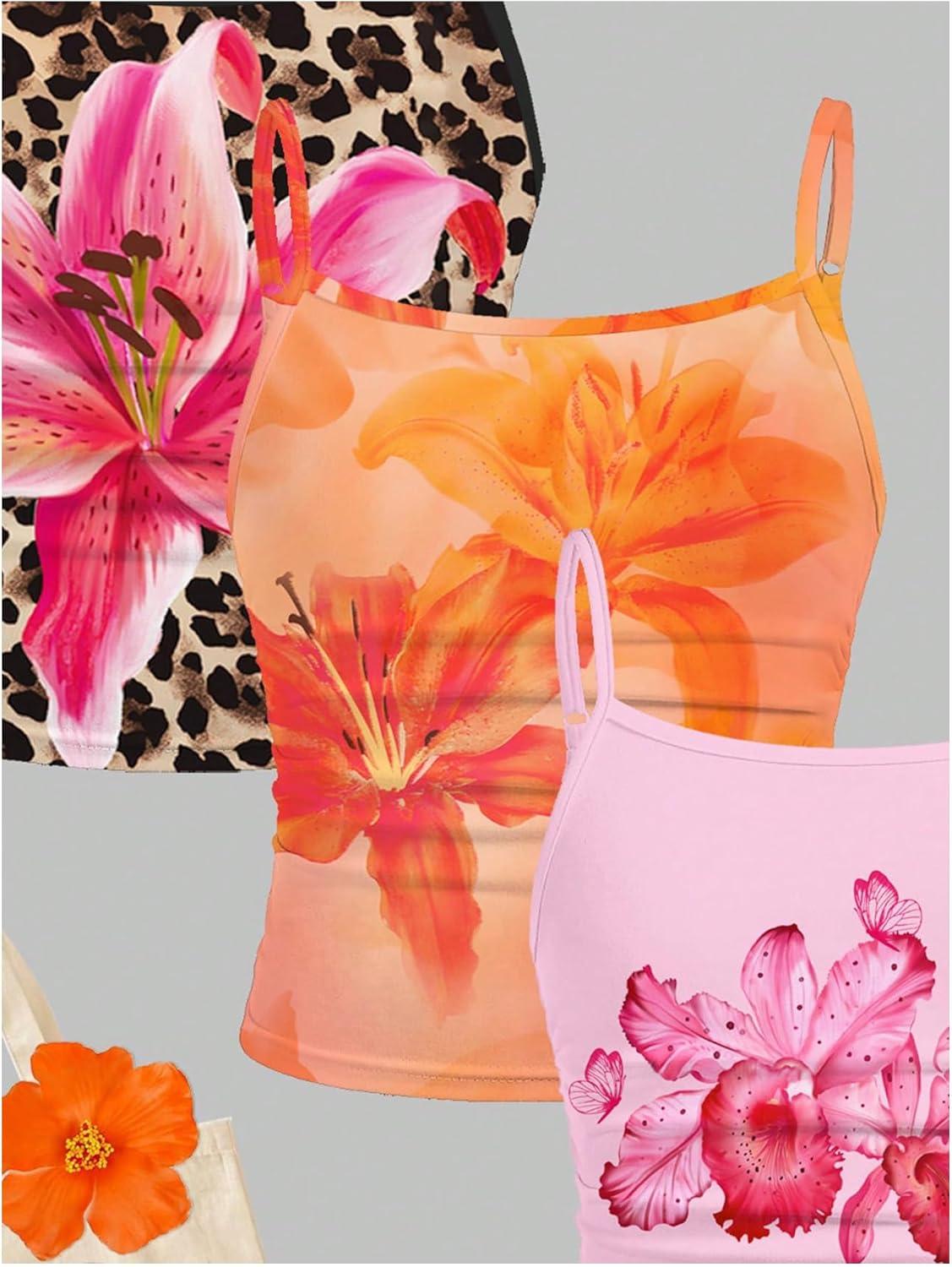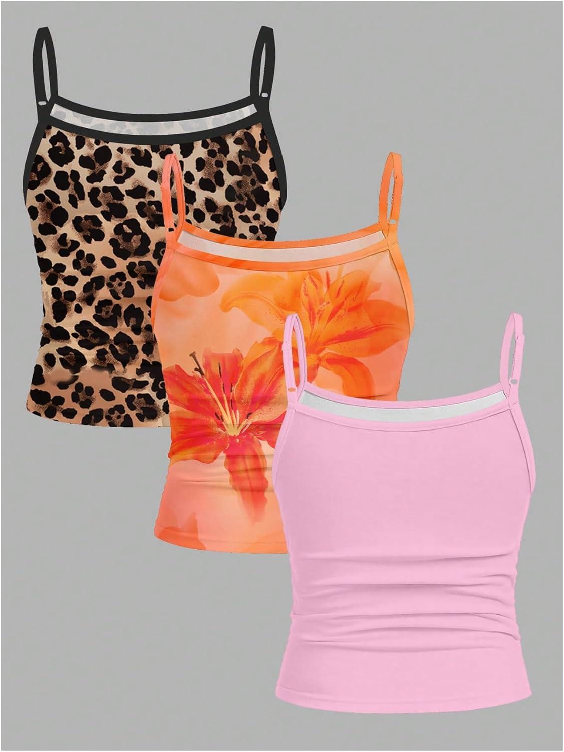 Girl's 3 Packs Cheetah Leopard Floral Tank Top Spaghetti Strap Fitted Summer Cute Camisole Tops(Multicolor)