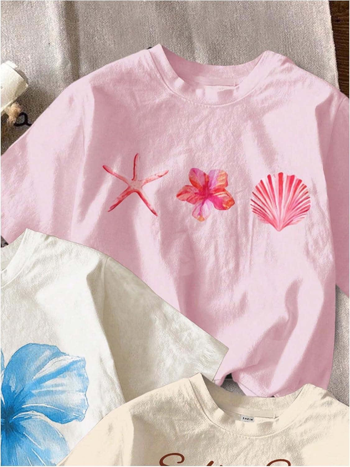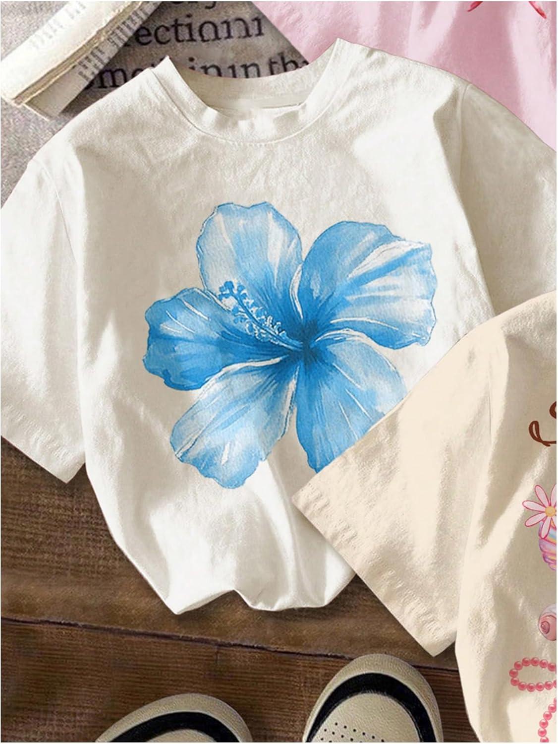 imageGirls 3 Packs Star Butterfly Graphic Tees Crew Neck Short Sleeve T Shirt Casual TopsBeige Blue Pink