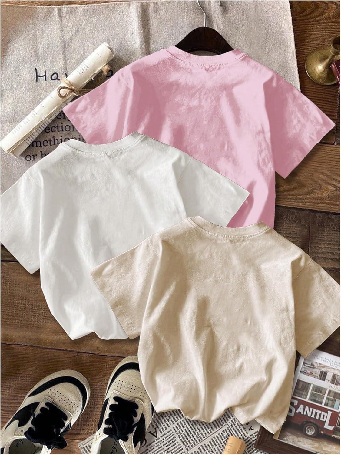 Girl’s 3 Packs Star Butterfly Graphic Tees Crew Neck Short Sleeve T Shirt Casual Tops(Letter Multicolor)