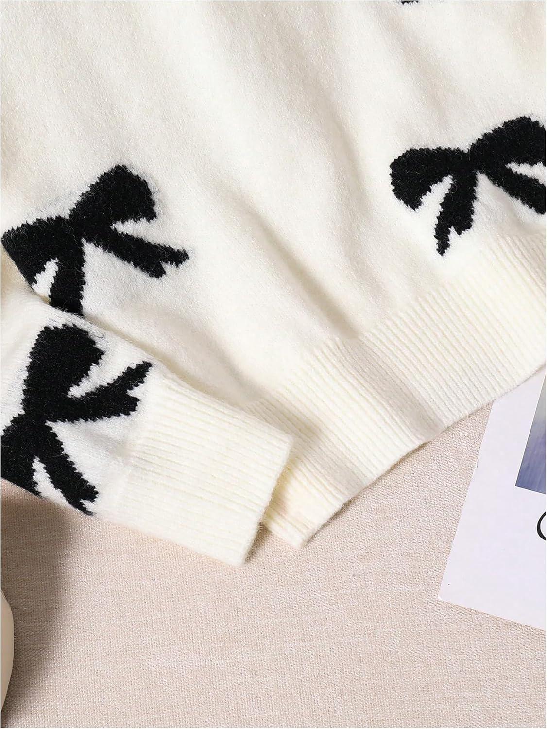 imageGirls Bow Graphic Sweaters Crewneck Long Sleeve Knit Pullover Tops Drop Shoulder KnitwearBlack and White