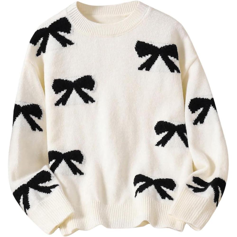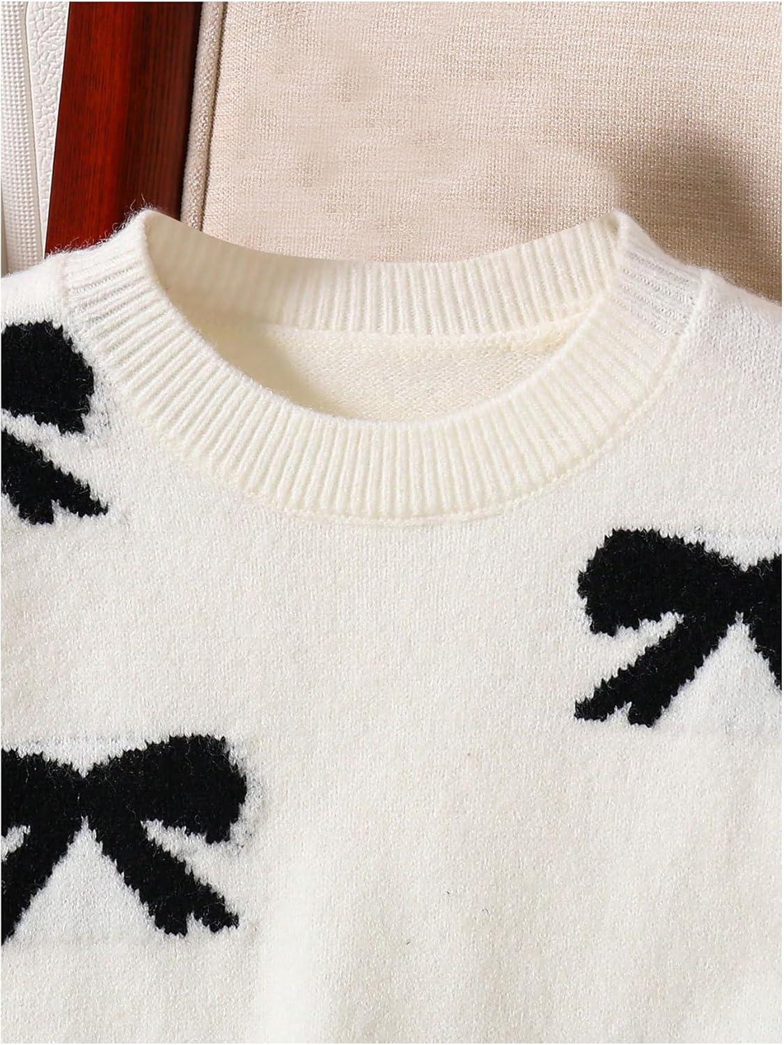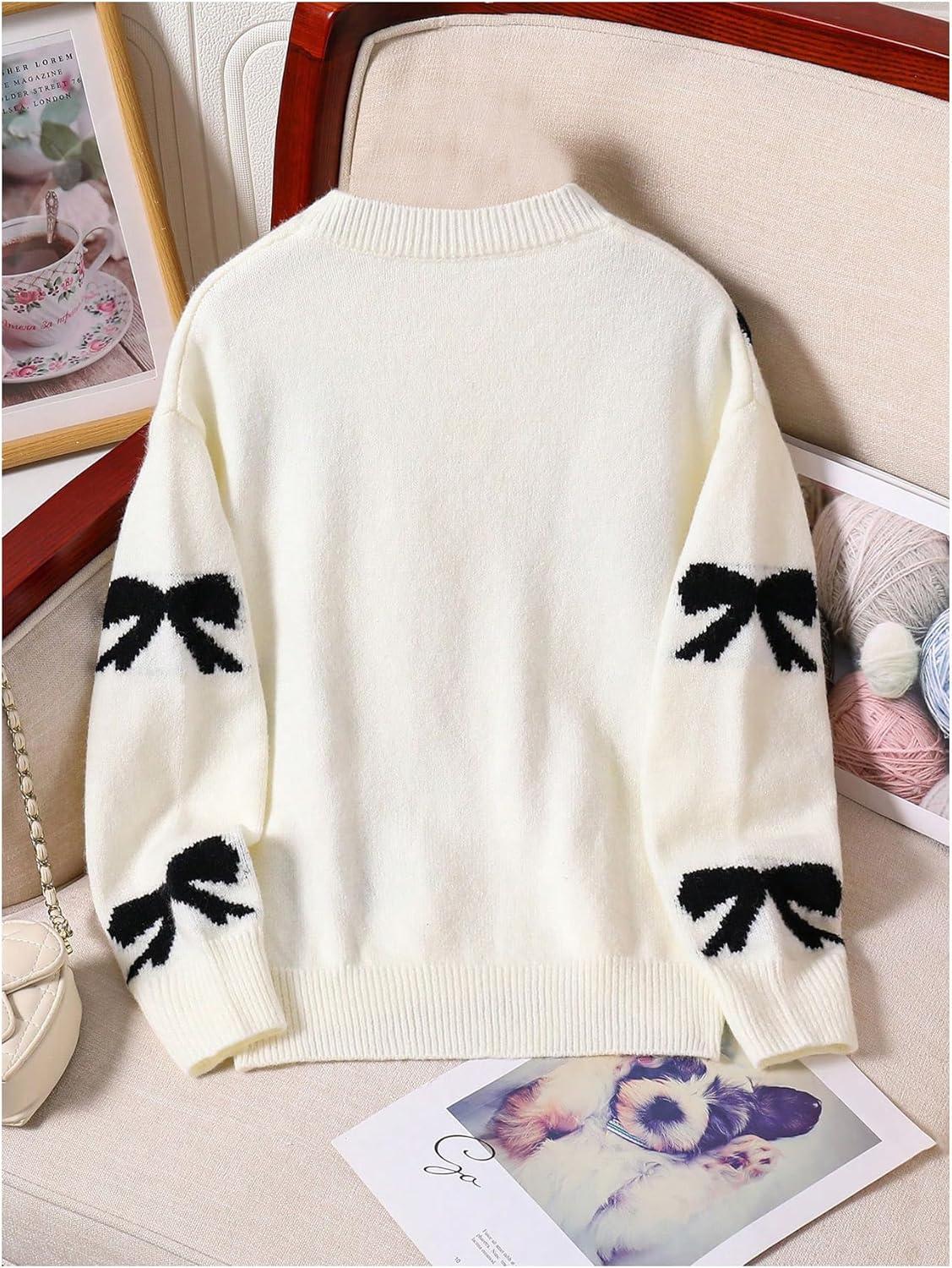Girl’s Bow Graphic Sweaters Crewneck Long Sleeve Knit Pullover Tops Drop Shoulder Knitwear(Black and White)