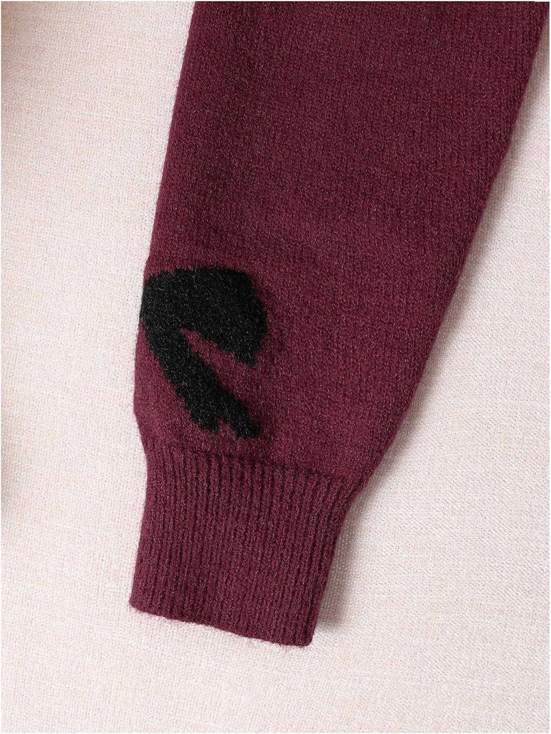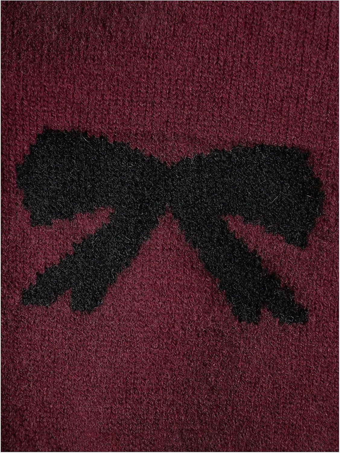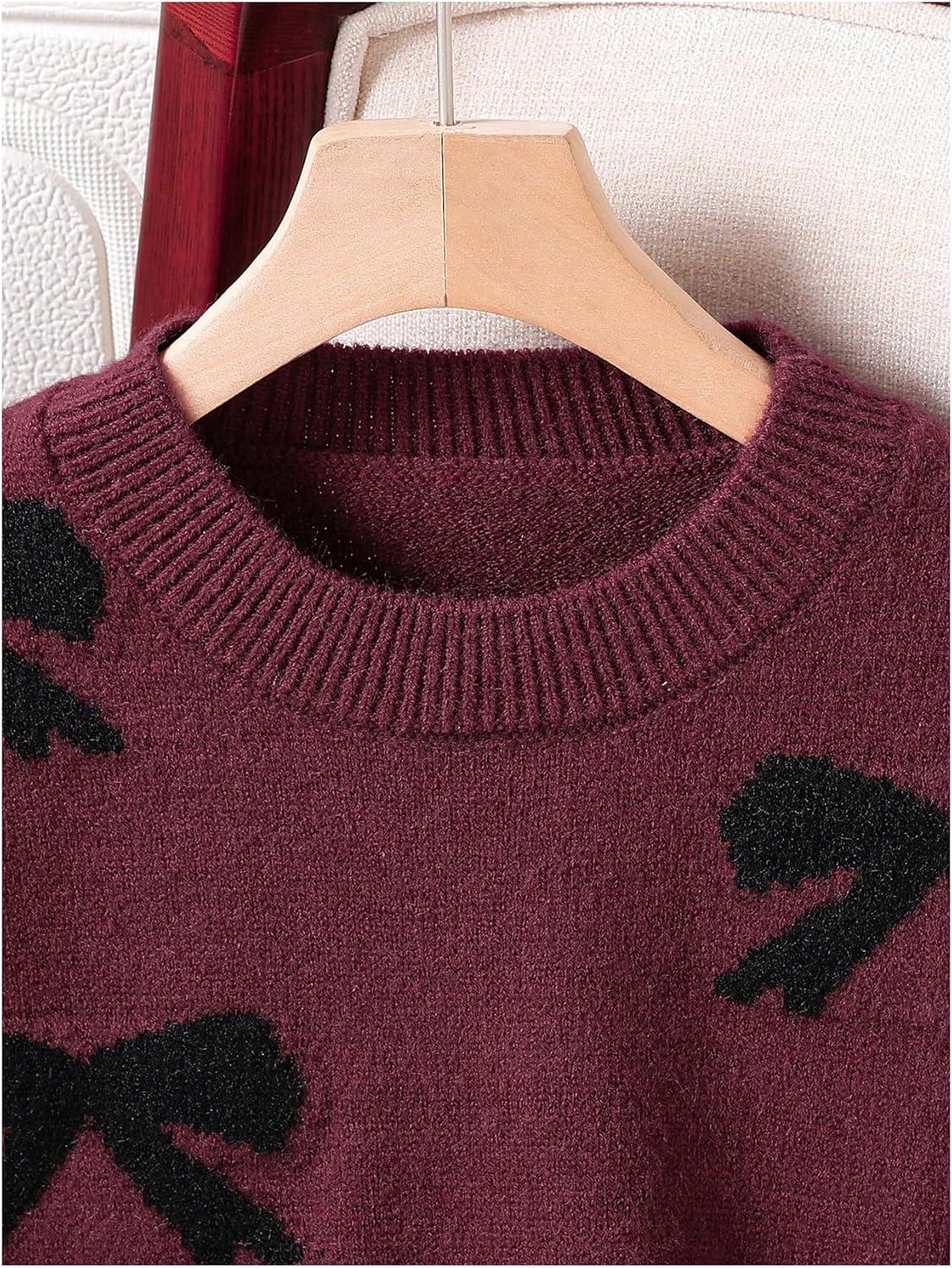 Girl's Bow Graphic Sweaters Crewneck Long Sleeve Knit Pullover Tops Drop Shoulder Knitwear(Burgundy)