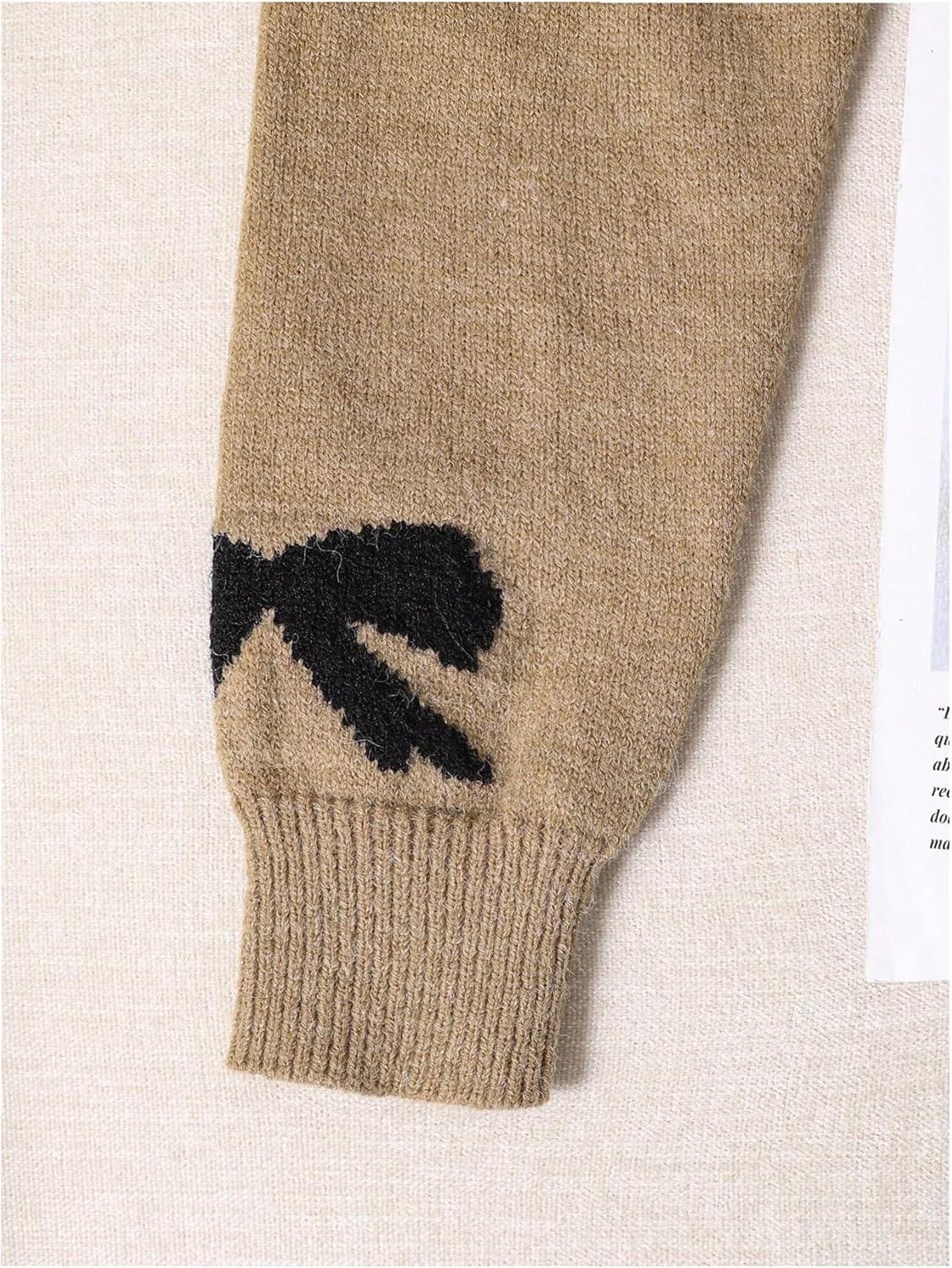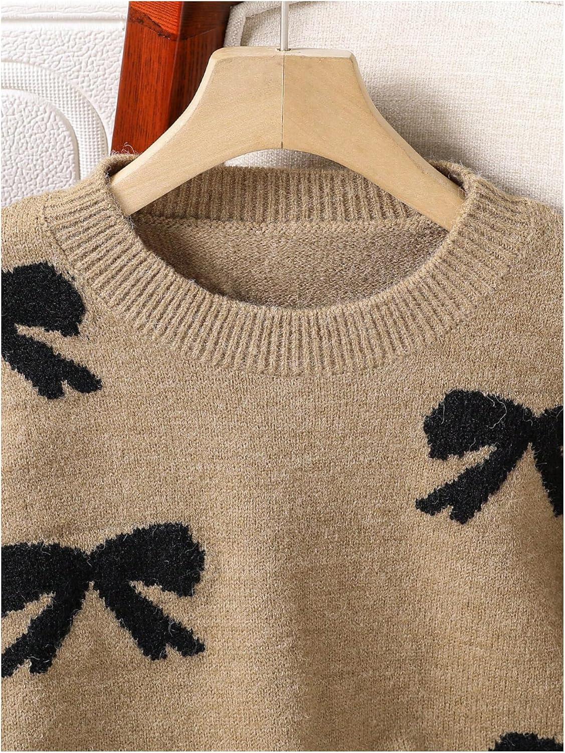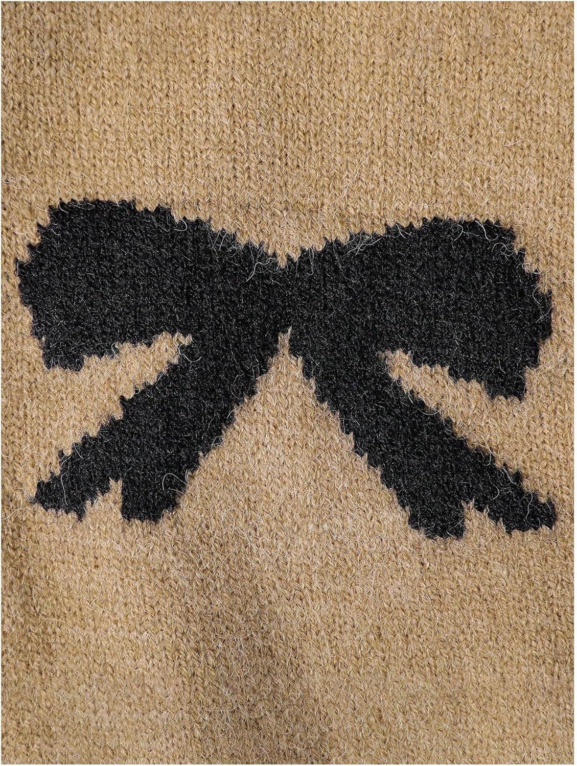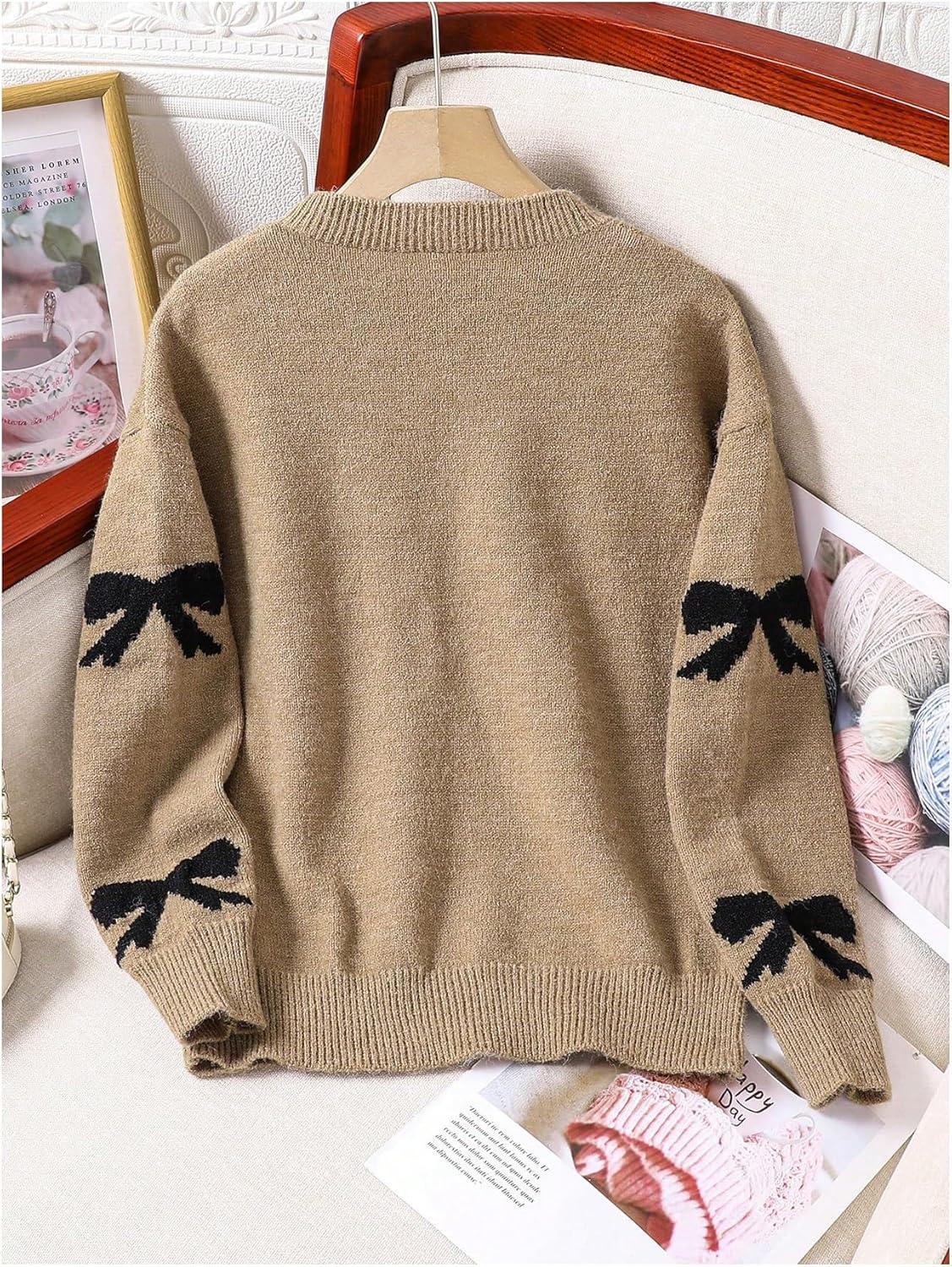 Girl's Bow Graphic Sweaters Crewneck Long Sleeve Knit Pullover Tops Drop Shoulder Knitwear(Khaki)