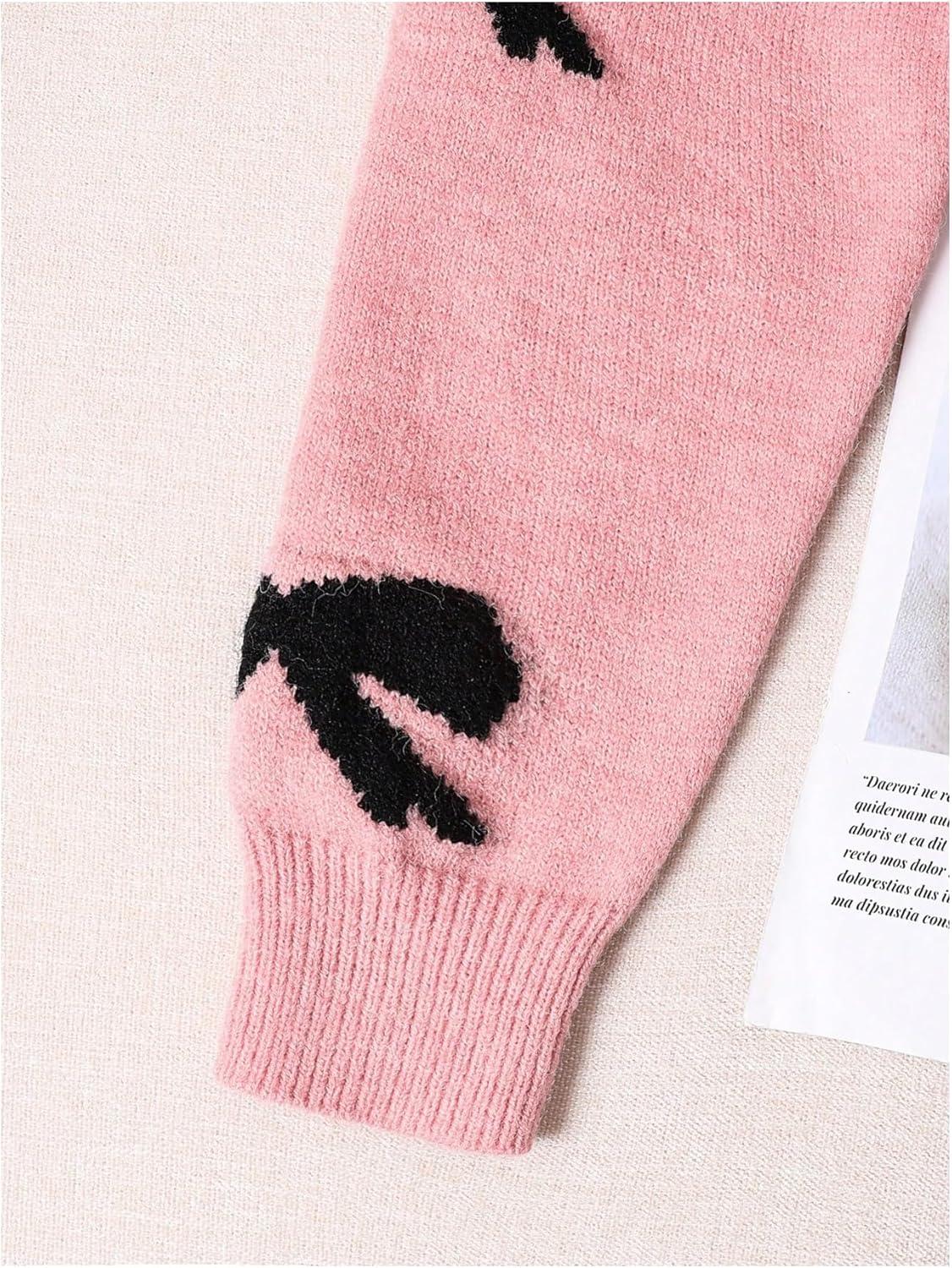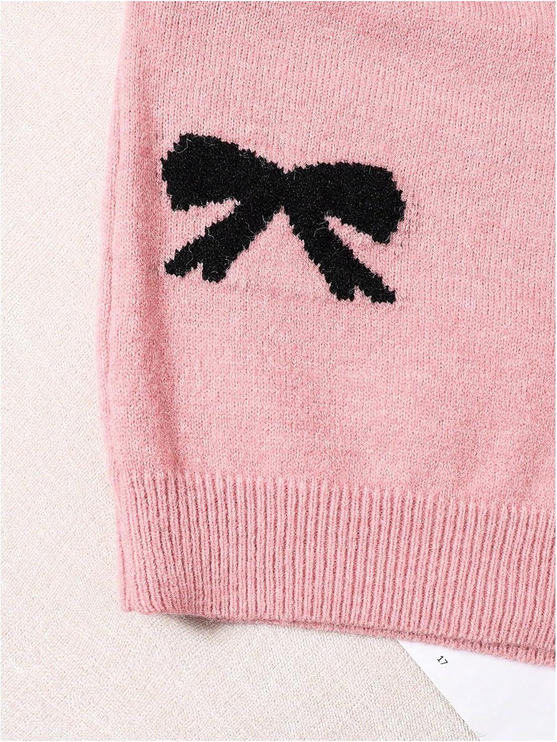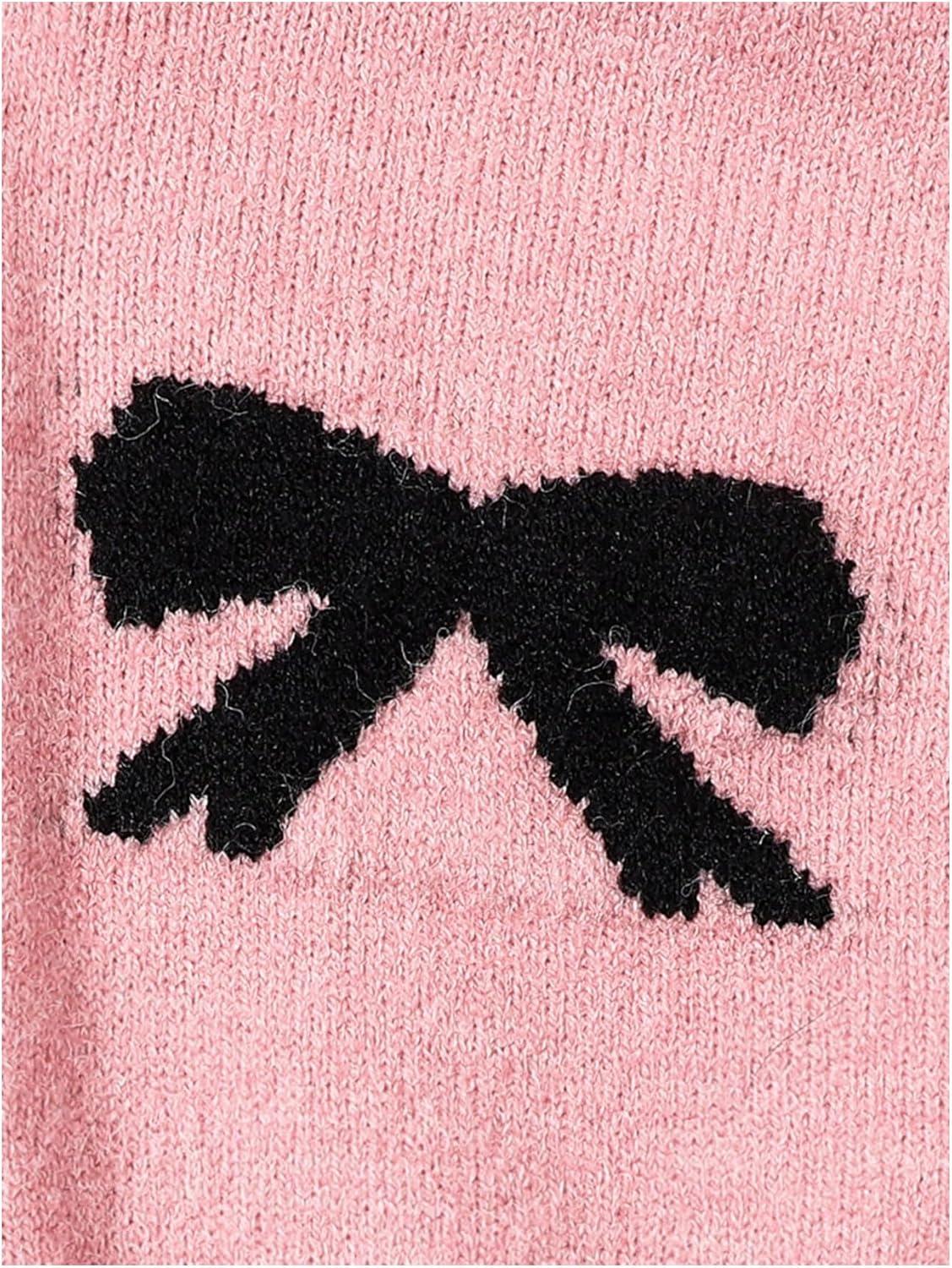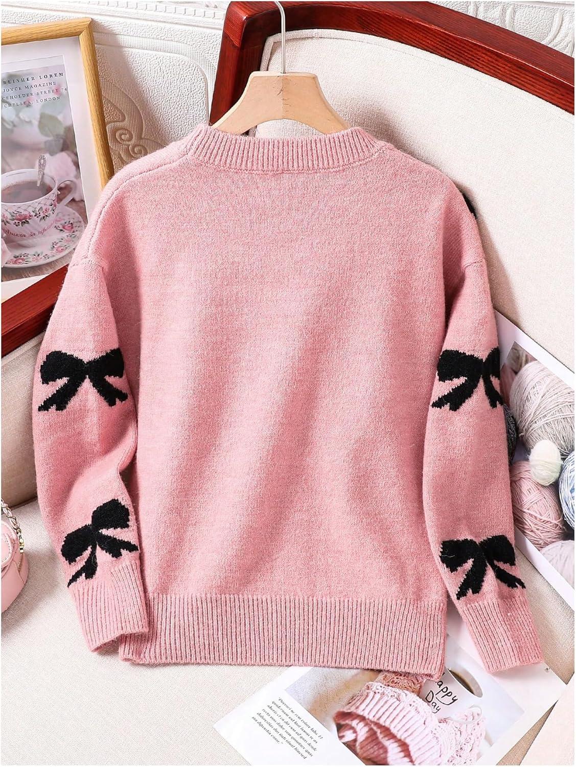 Girl’s Bow Graphic Sweaters Crewneck Long Sleeve Knit Pullover Tops Drop Shoulder Knitwear(Pink)