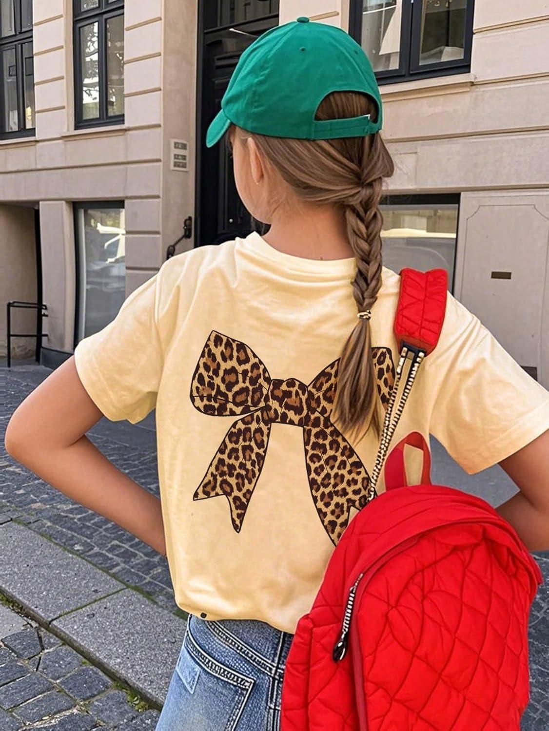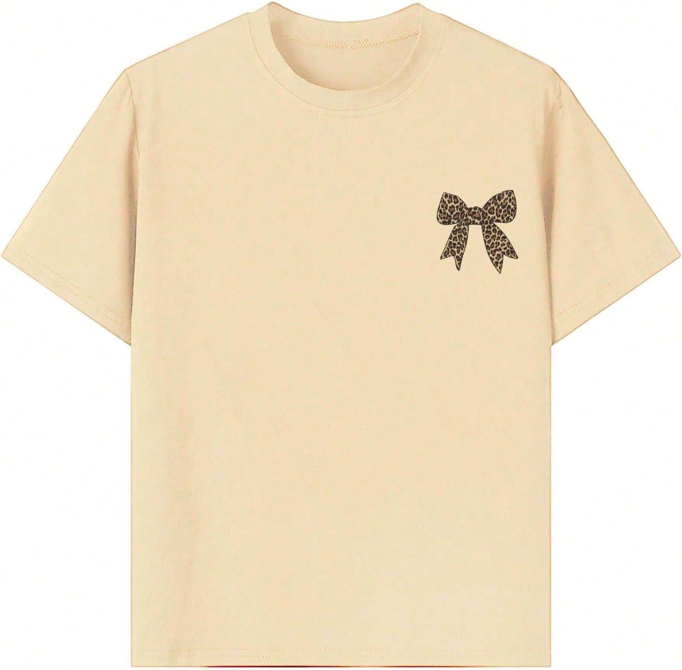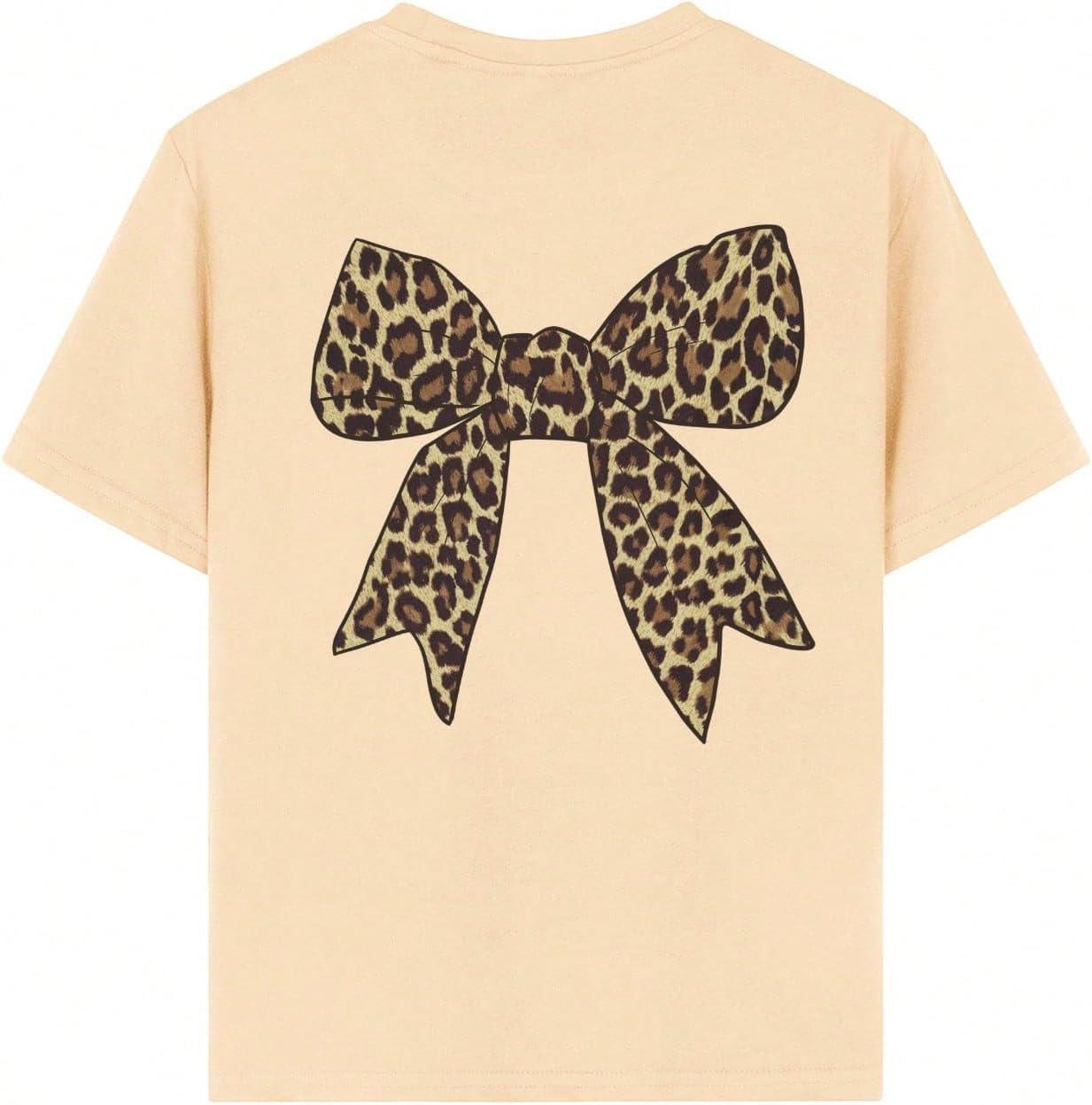 Girl's Bow Leopard Graphic Tees Short Sleeve Preppy Summer T Shirt Aesthetic Baggy Tops(Bow Pricot)