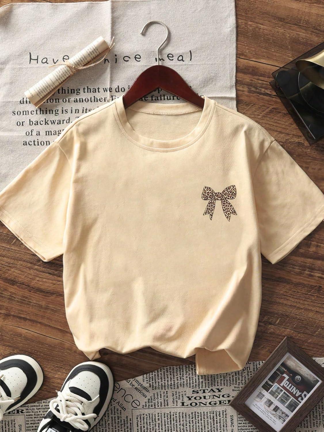 Girl’s Bow Leopard Graphic Tees Short Sleeve Preppy Summer T Shirt Aesthetic Baggy Tops(Beige)