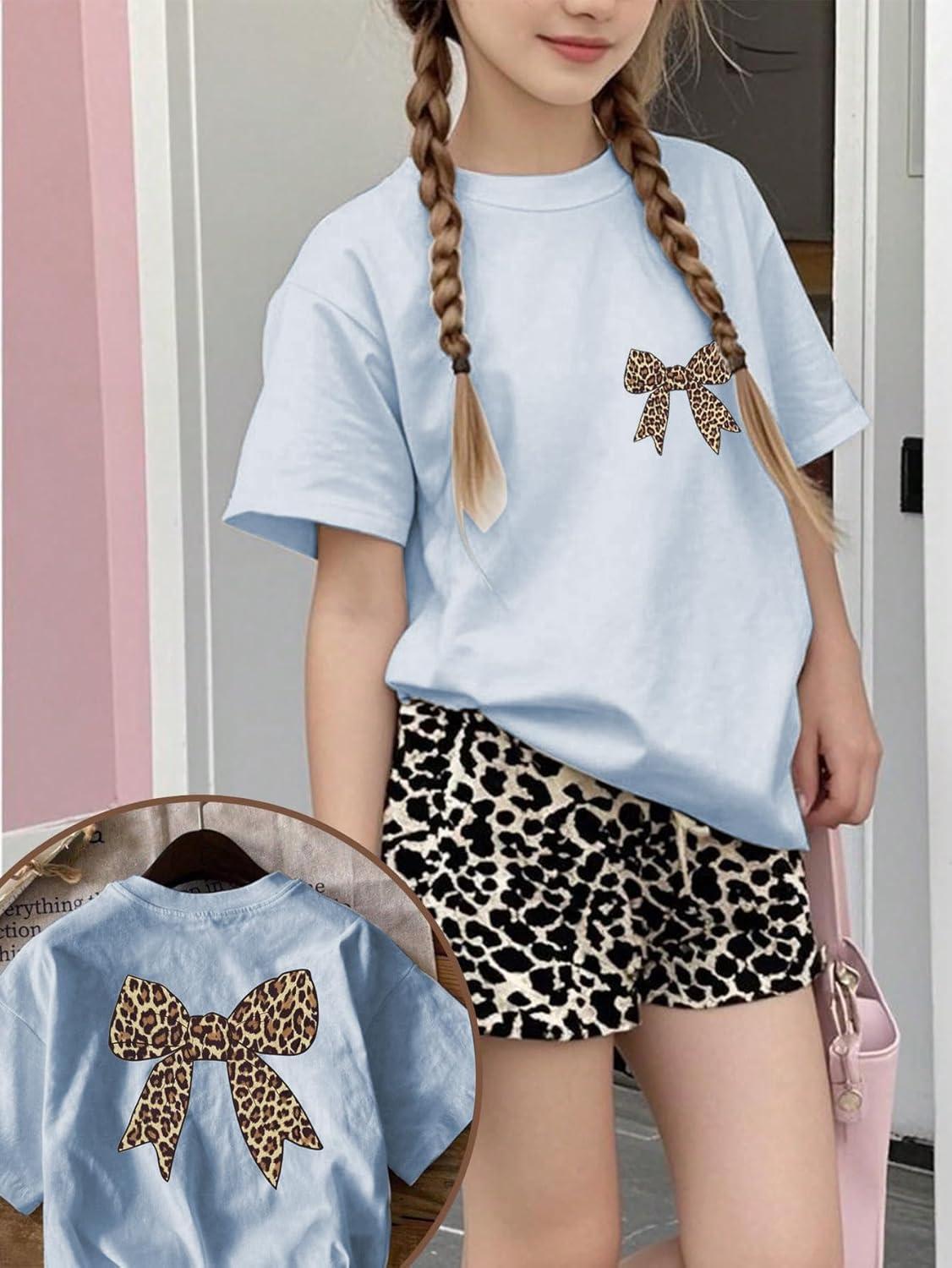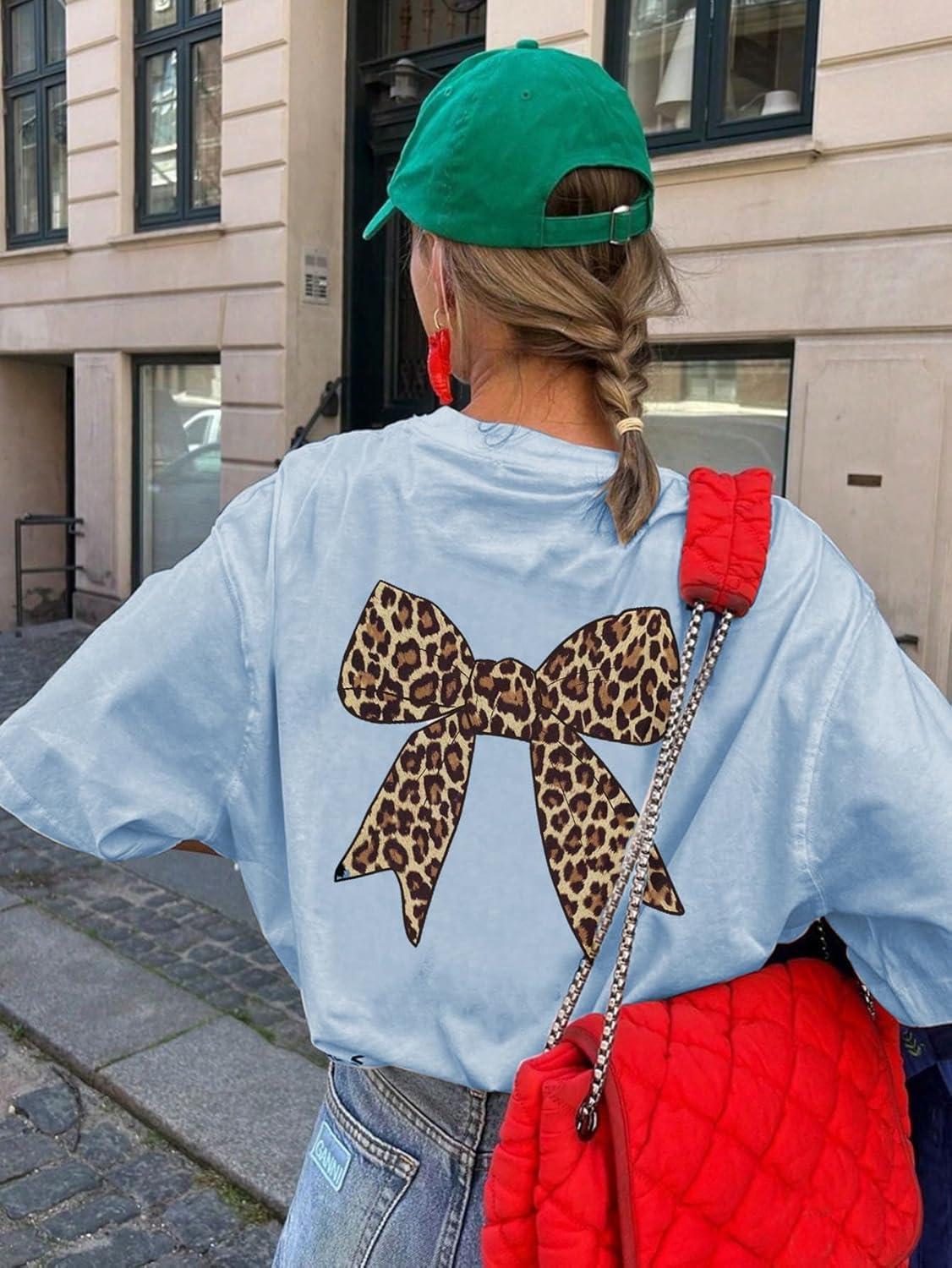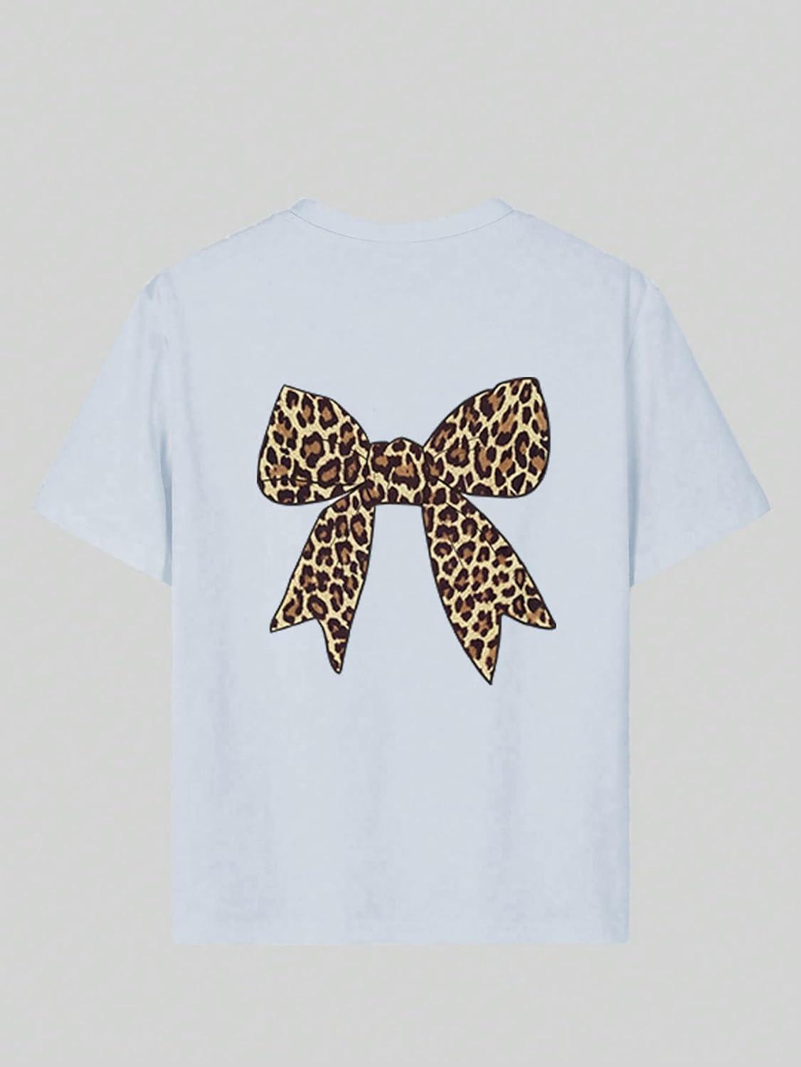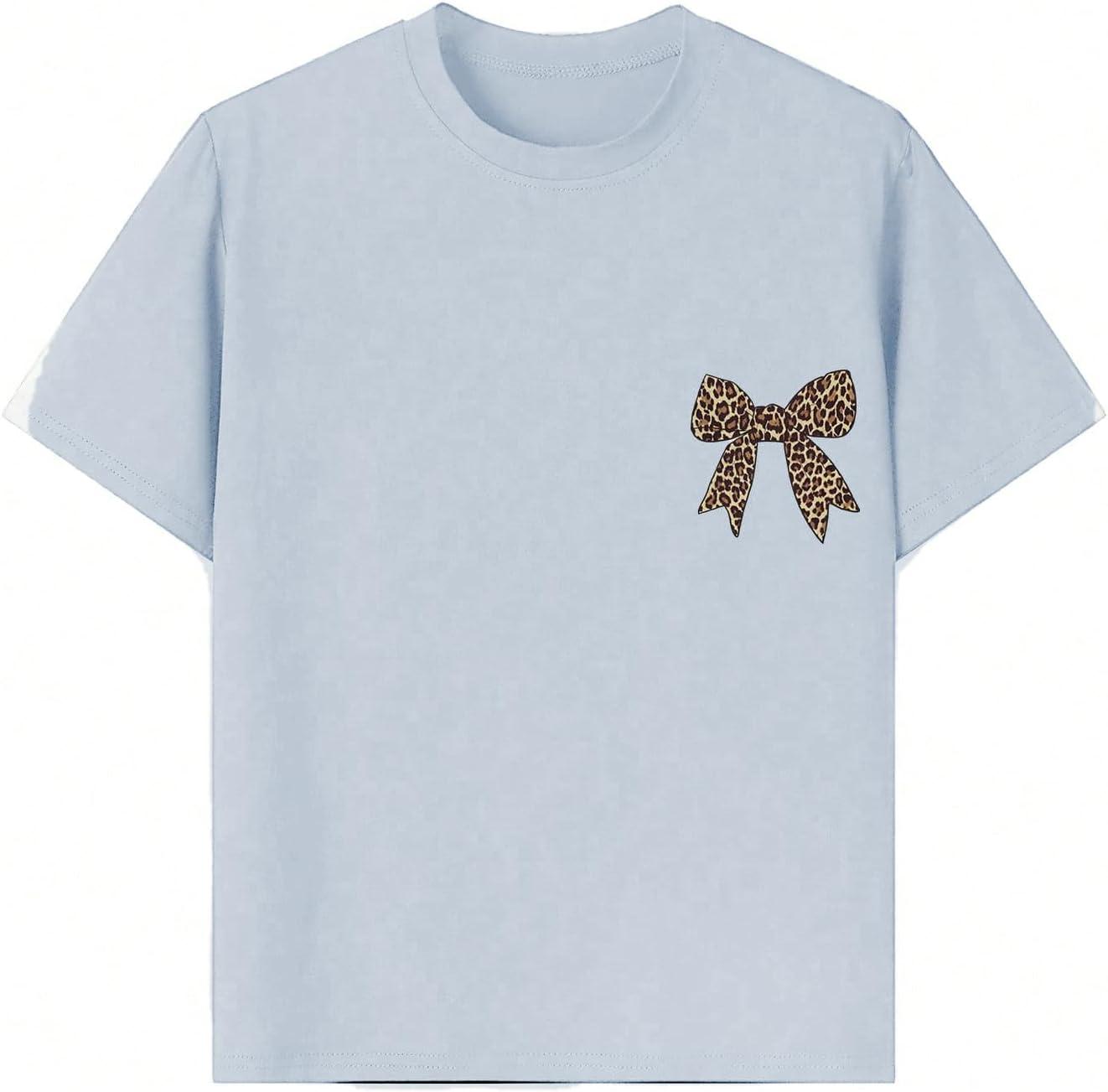 Girl's Bow Leopard Graphic Tees Short Sleeve Preppy Summer T Shirt Aesthetic Baggy Tops(Bowknot Blue)