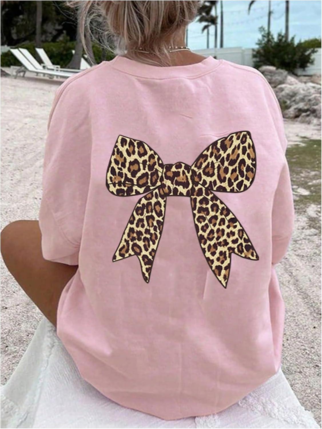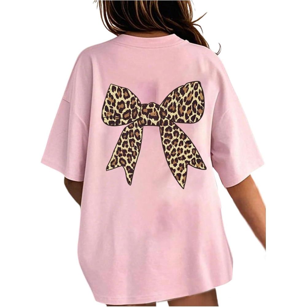 Girl’s Bow Leopard Graphic Tees Short Sleeve Preppy Summer T Shirt Aesthetic Baggy Tops(Pink)