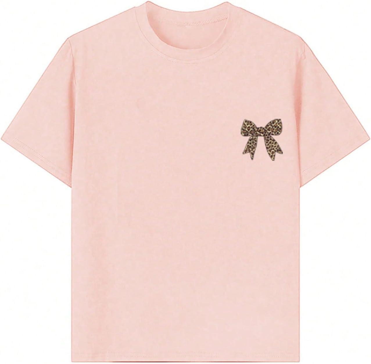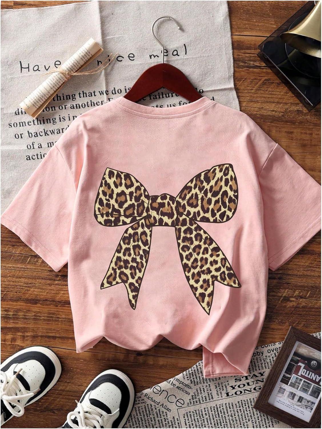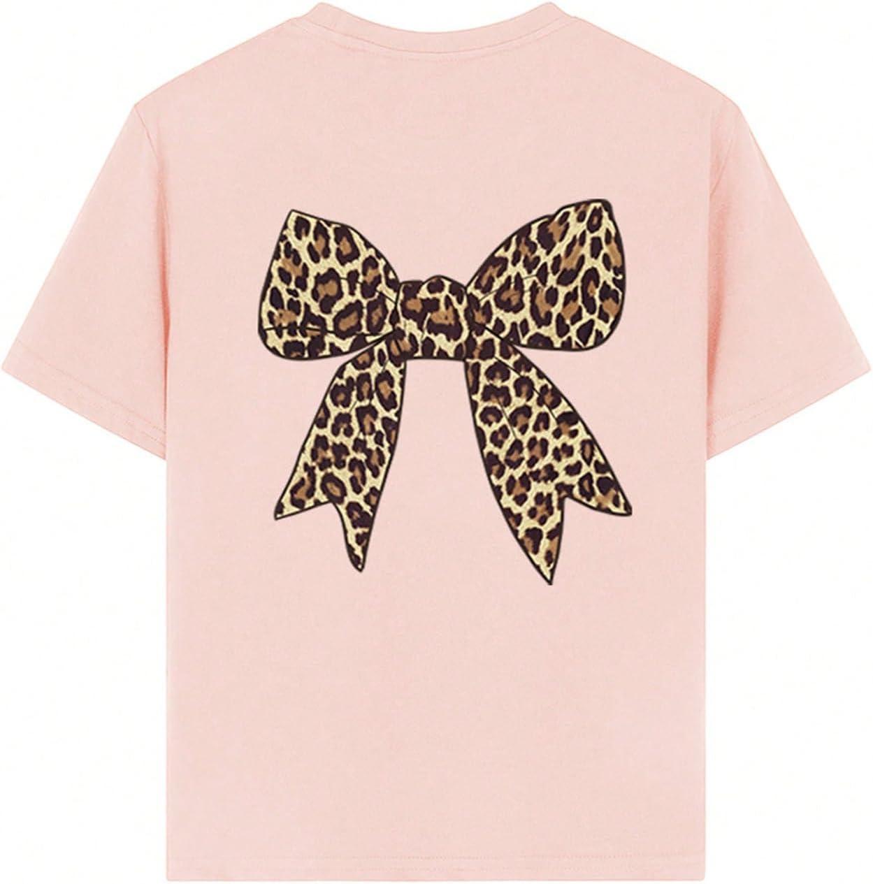 Girl's Bow Leopard Graphic Tees Short Sleeve Preppy Summer T Shirt Aesthetic Baggy Tops(Light Pink)