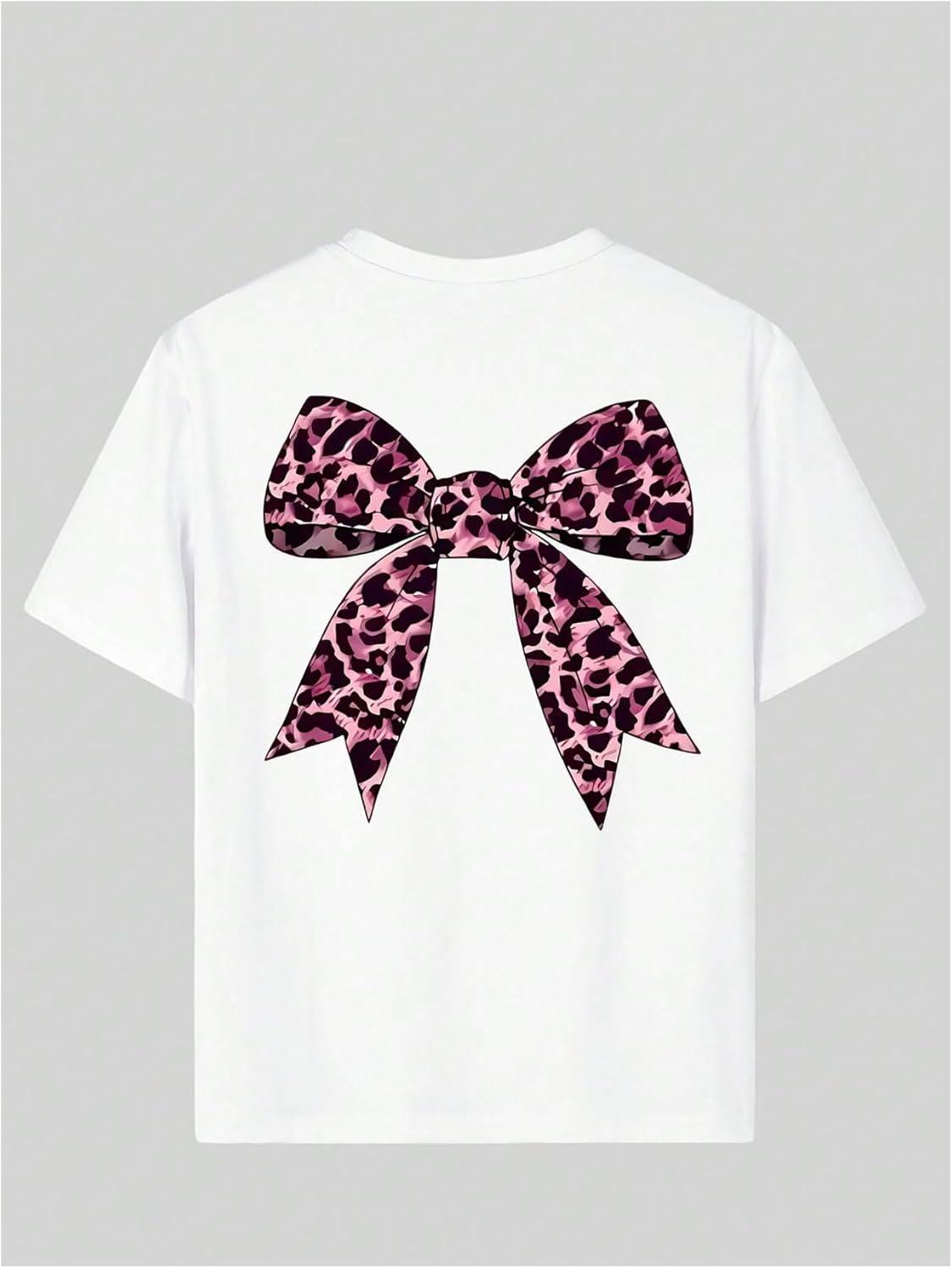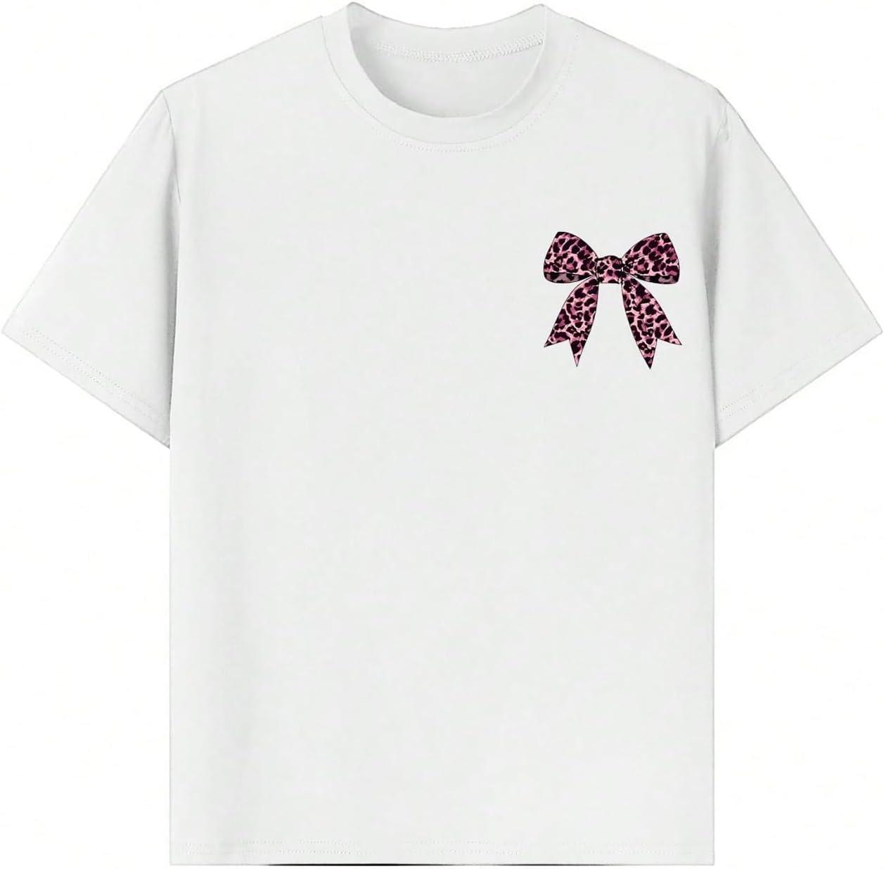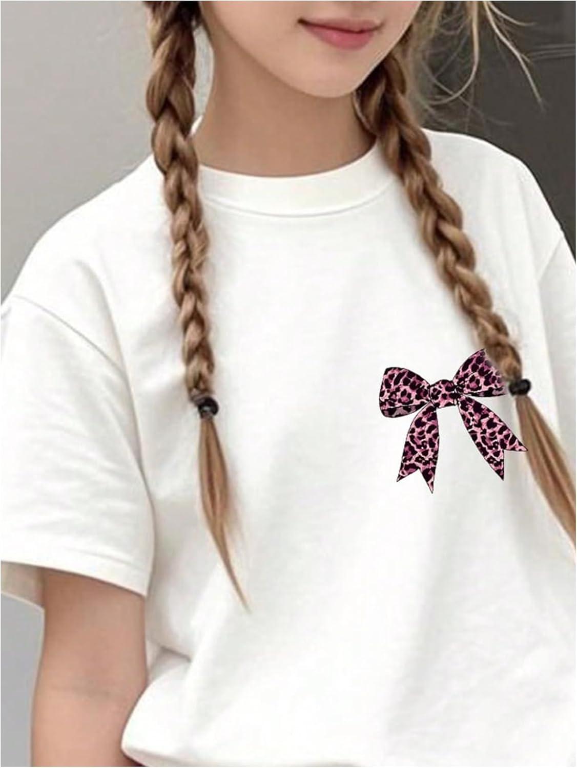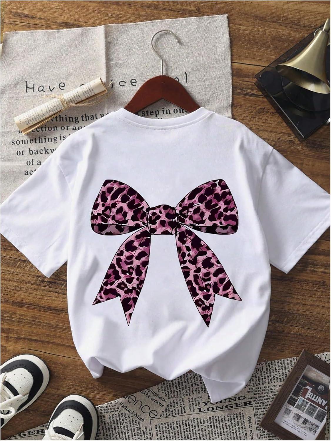Girl's Bow Leopard Graphic Tees Short Sleeve Preppy Summer T Shirt Aesthetic Baggy Tops(White Bow)