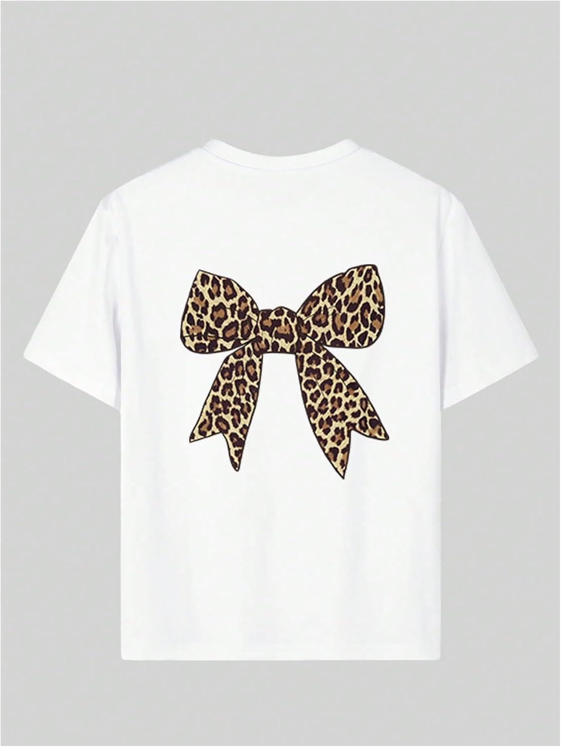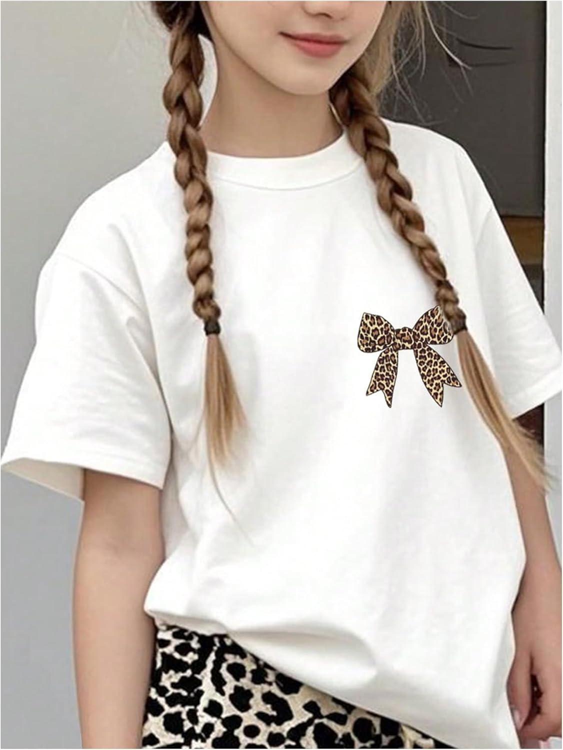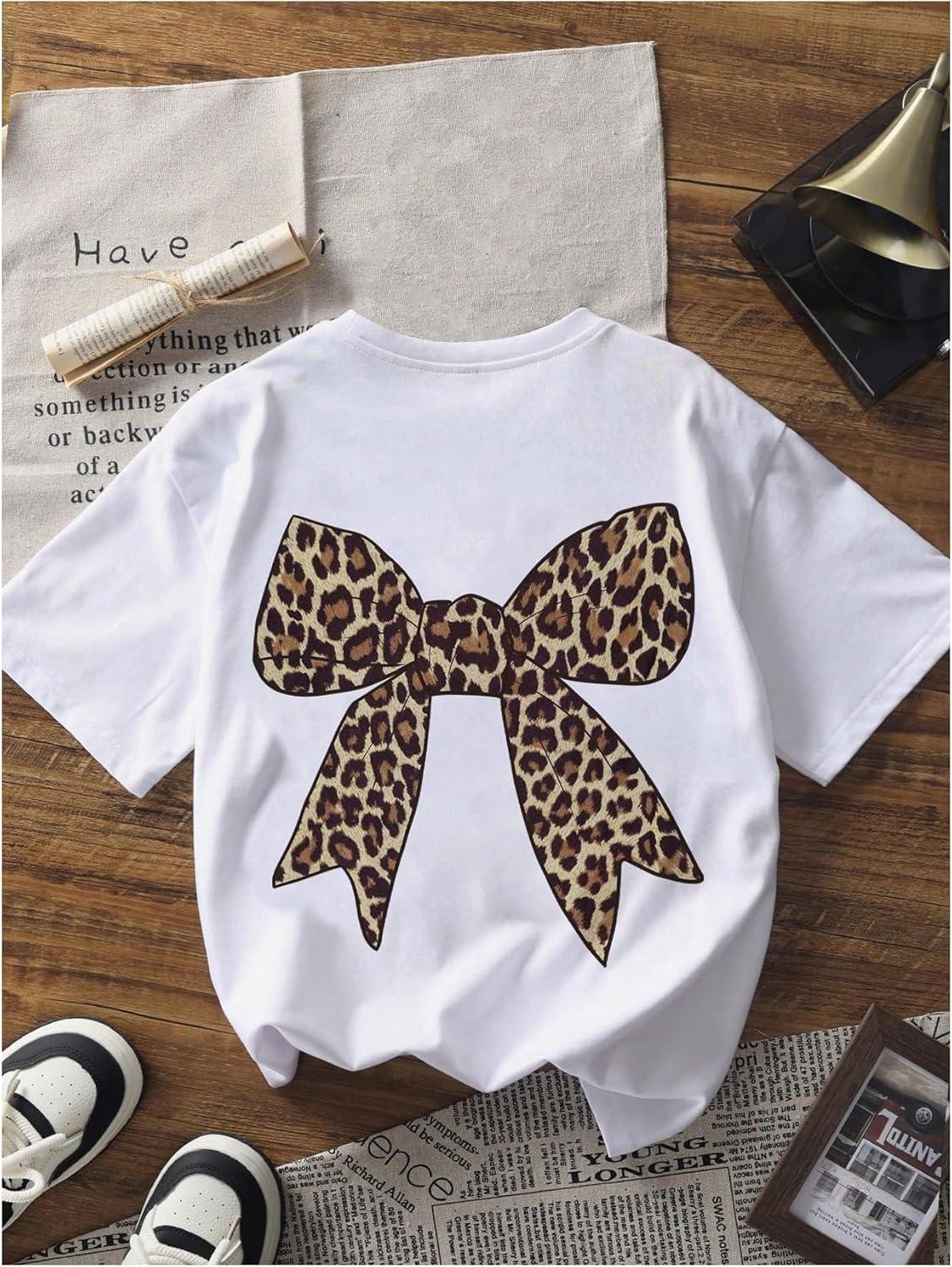 Girl’s Bow Leopard Graphic Tees Short Sleeve Preppy Summer T Shirt Aesthetic Baggy Tops(White Bow)