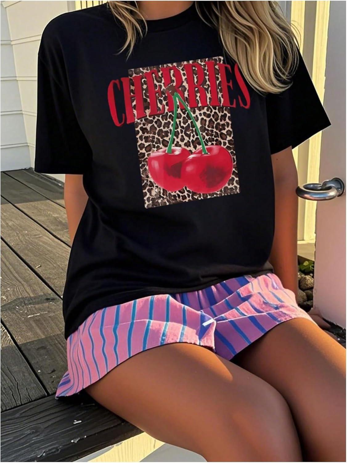 Girl's Cherry Leopard Shirt Short Sleeve Loose Cute Summer T Shirt Trendy Aesthetic Baggy Tops(Black and Red)