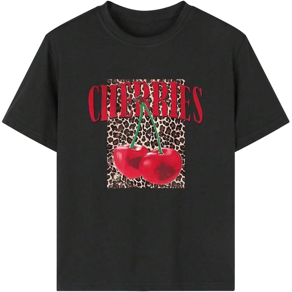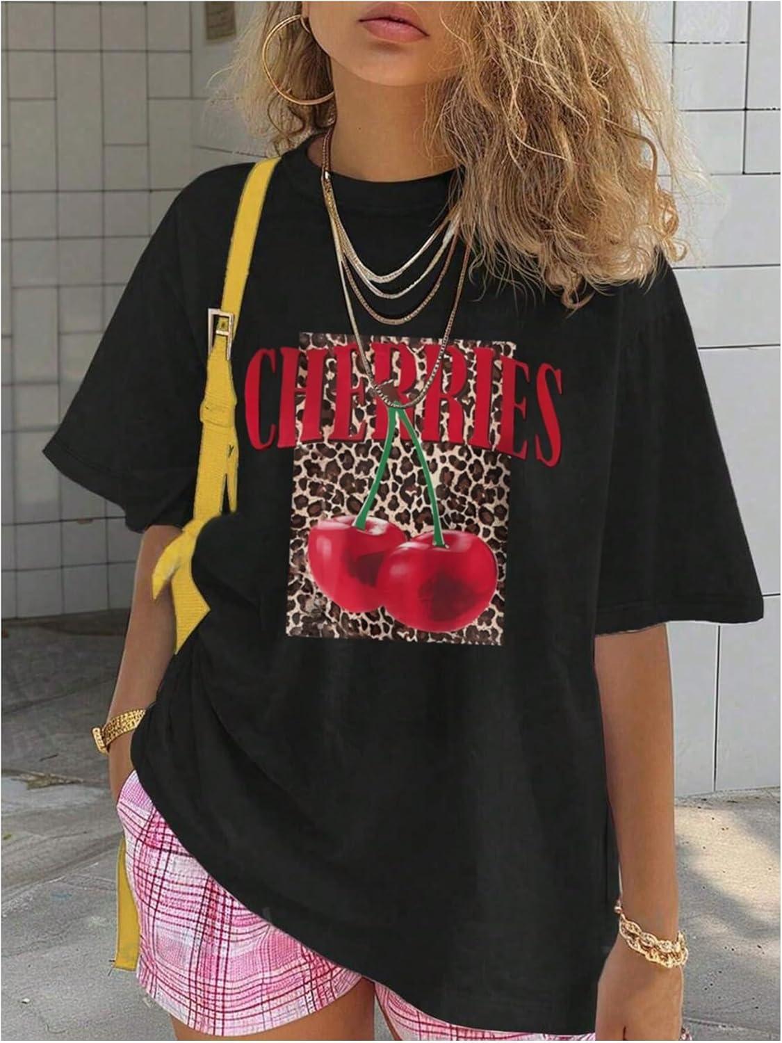 Girl’s Cherry Leopard Shirt Short Sleeve Loose Cute Summer T Shirt Trendy Aesthetic Baggy Tops(Black and Red)