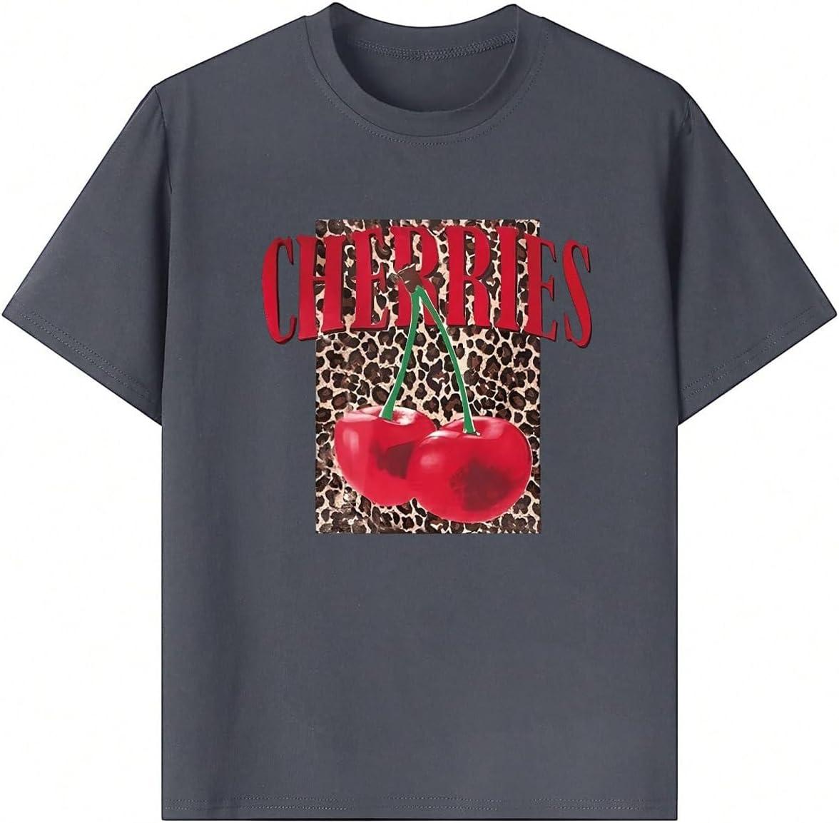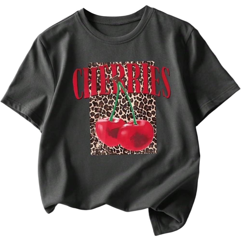 Girl's Cherry Leopard Shirt Short Sleeve Loose Cute Summer T Shirt Trendy Aesthetic Baggy Tops(Dark Grey)