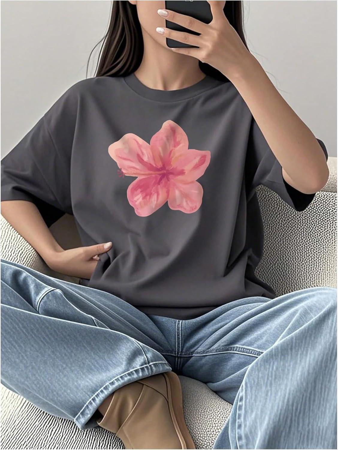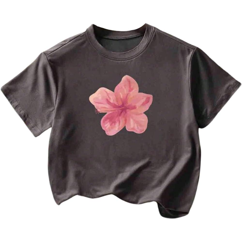 Girl’s Cherry Leopard Shirt Short Sleeve Loose Cute Summer T Shirt Trendy Aesthetic Baggy Tops(Flower White)