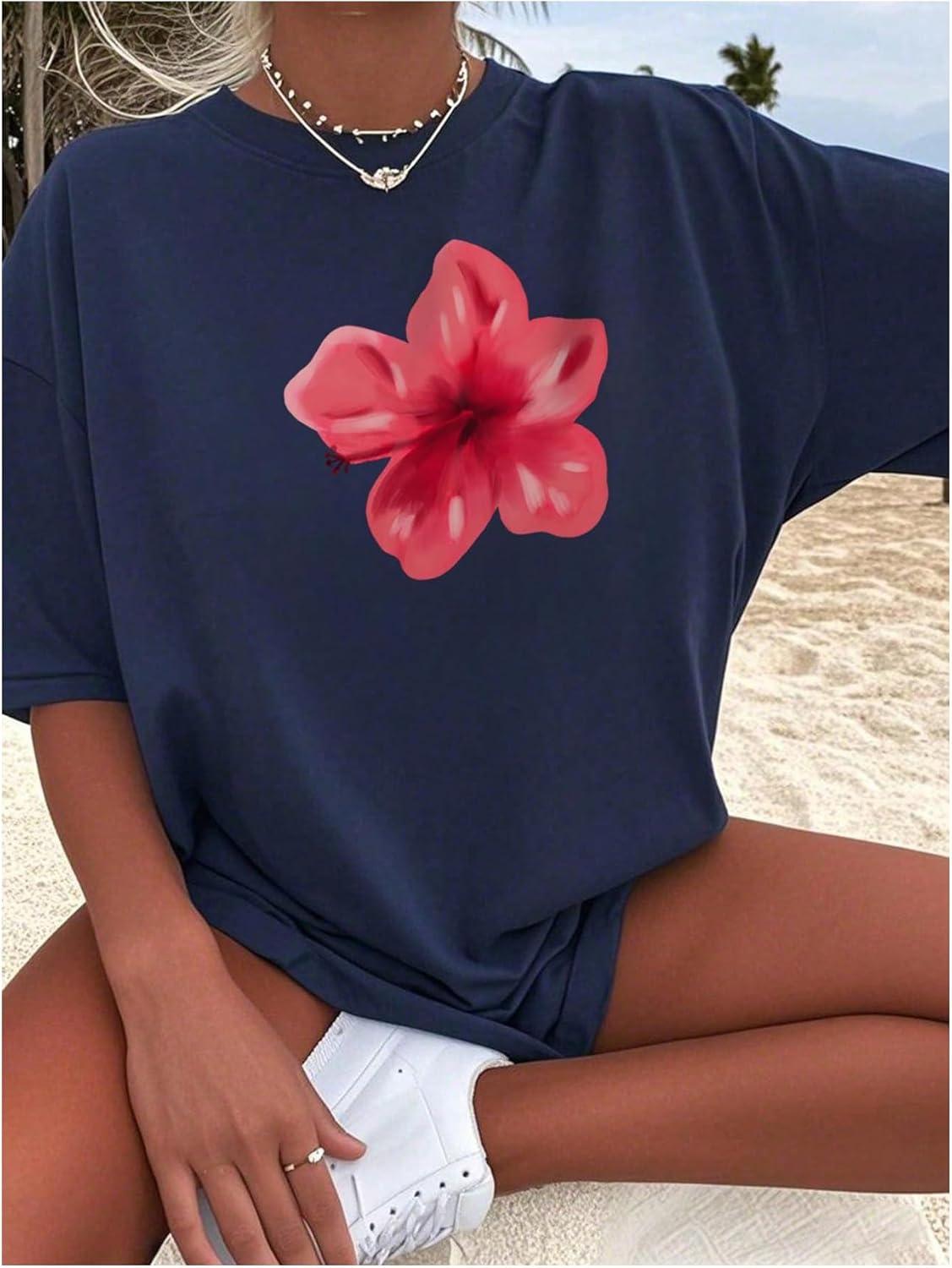 Girl’s Cherry Leopard Shirt Short Sleeve Loose Cute Summer T Shirt Trendy Aesthetic Baggy Tops(Floral Deep Blue)