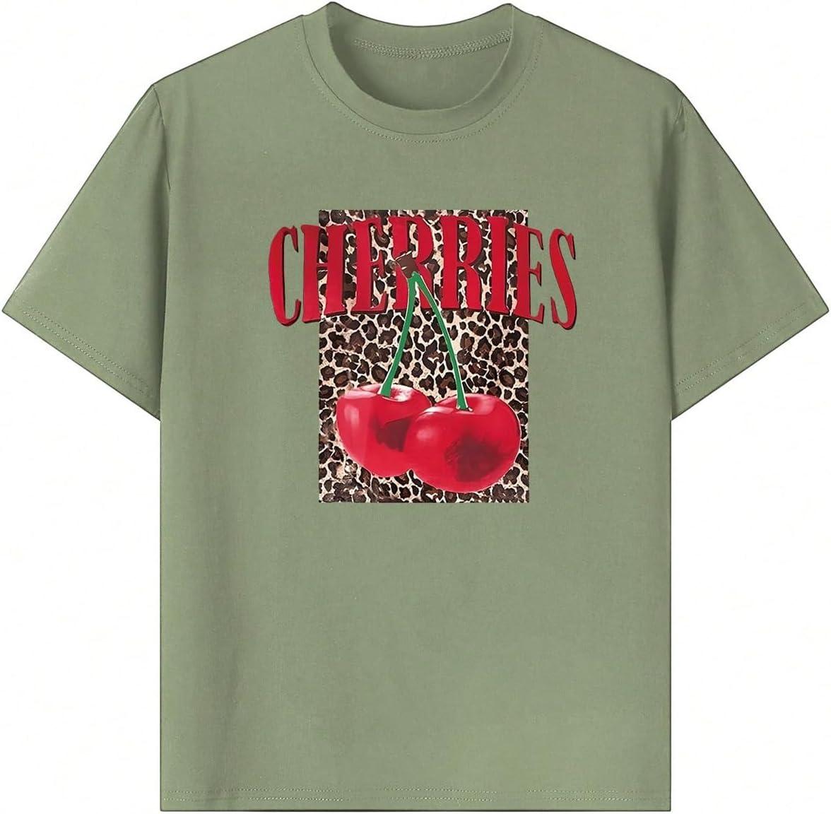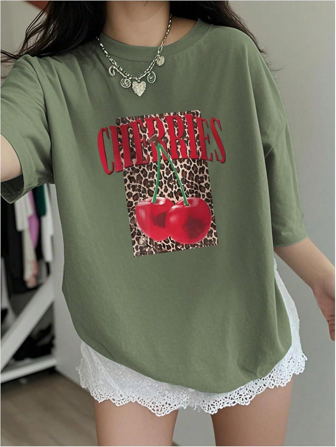 Girl's Cherry Leopard Shirt Short Sleeve Loose Cute Summer T Shirt Trendy Aesthetic Baggy Tops(Green)