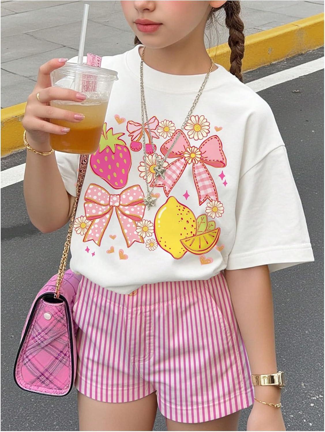 Girls Cherry Shirt Short Sleeve Colorblock Graphic Tees Cute Summer Shirts Y2k Aesthetic Clothes(Bow White)