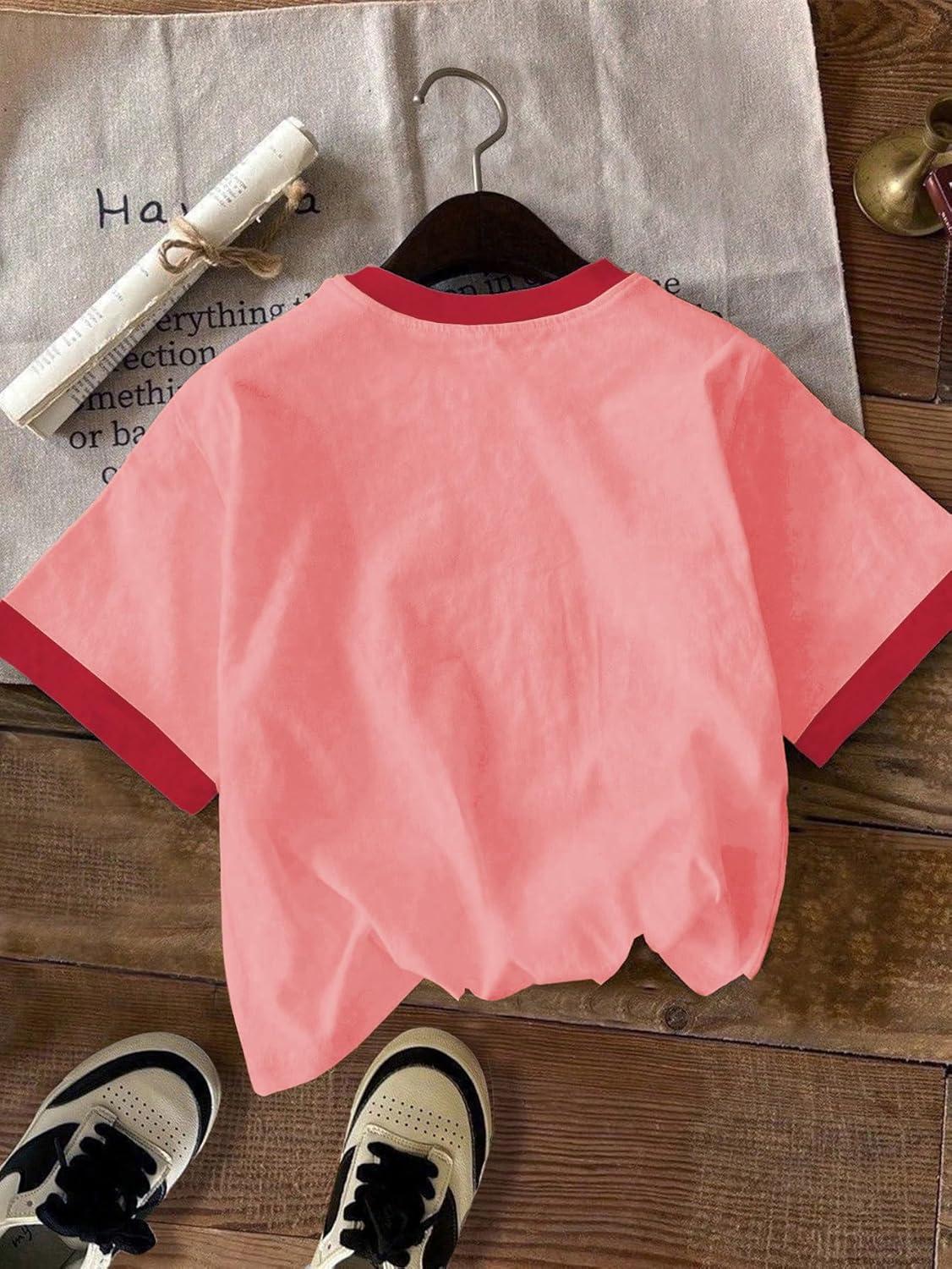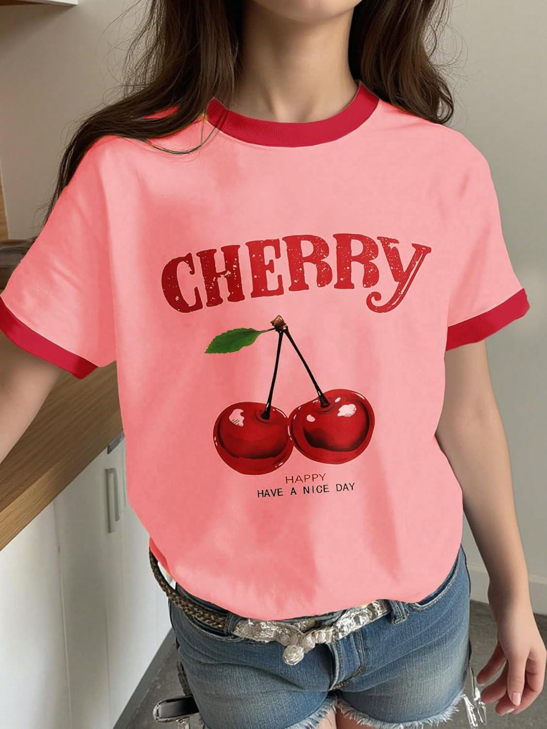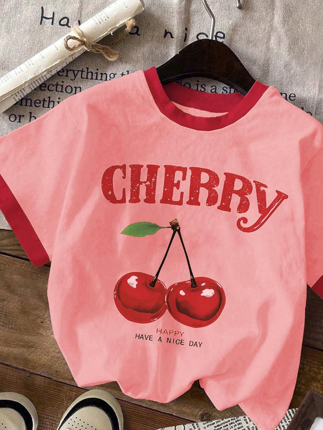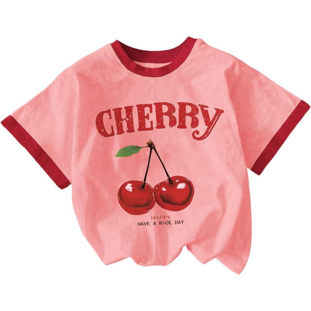 Girls Cherry Shirt Short Sleeve Colorblock Graphic Tees Cute Summer Shirts Y2k Aesthetic Clothes(Dusty Pink)