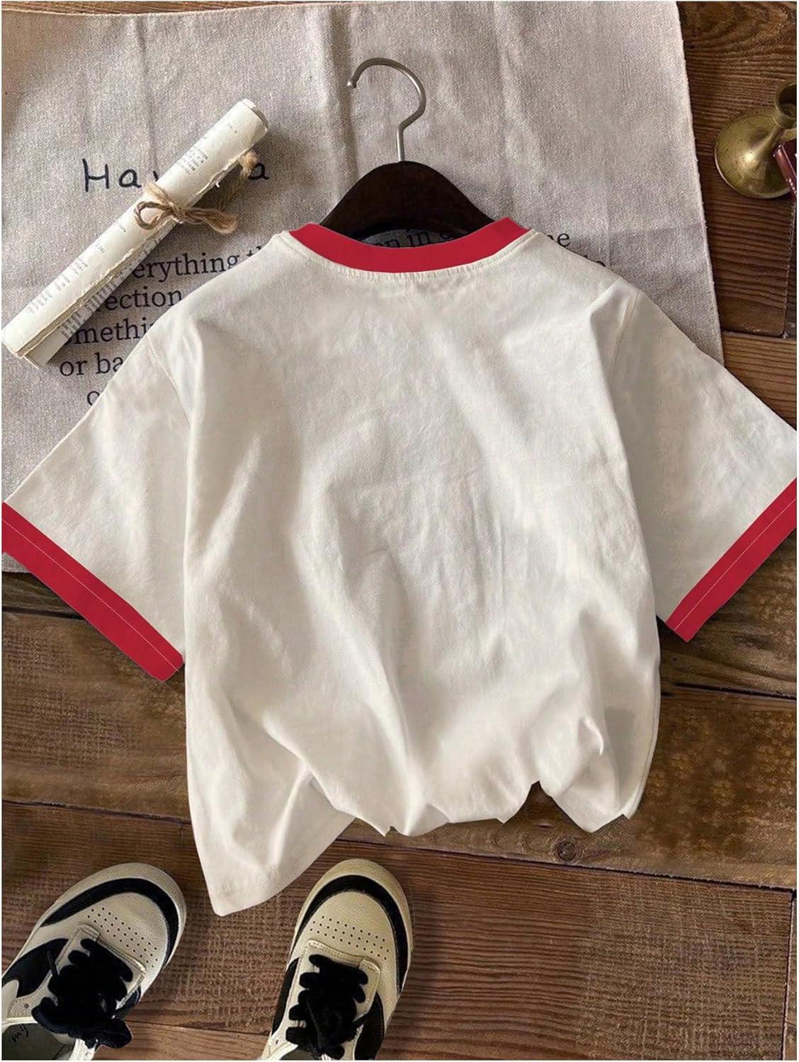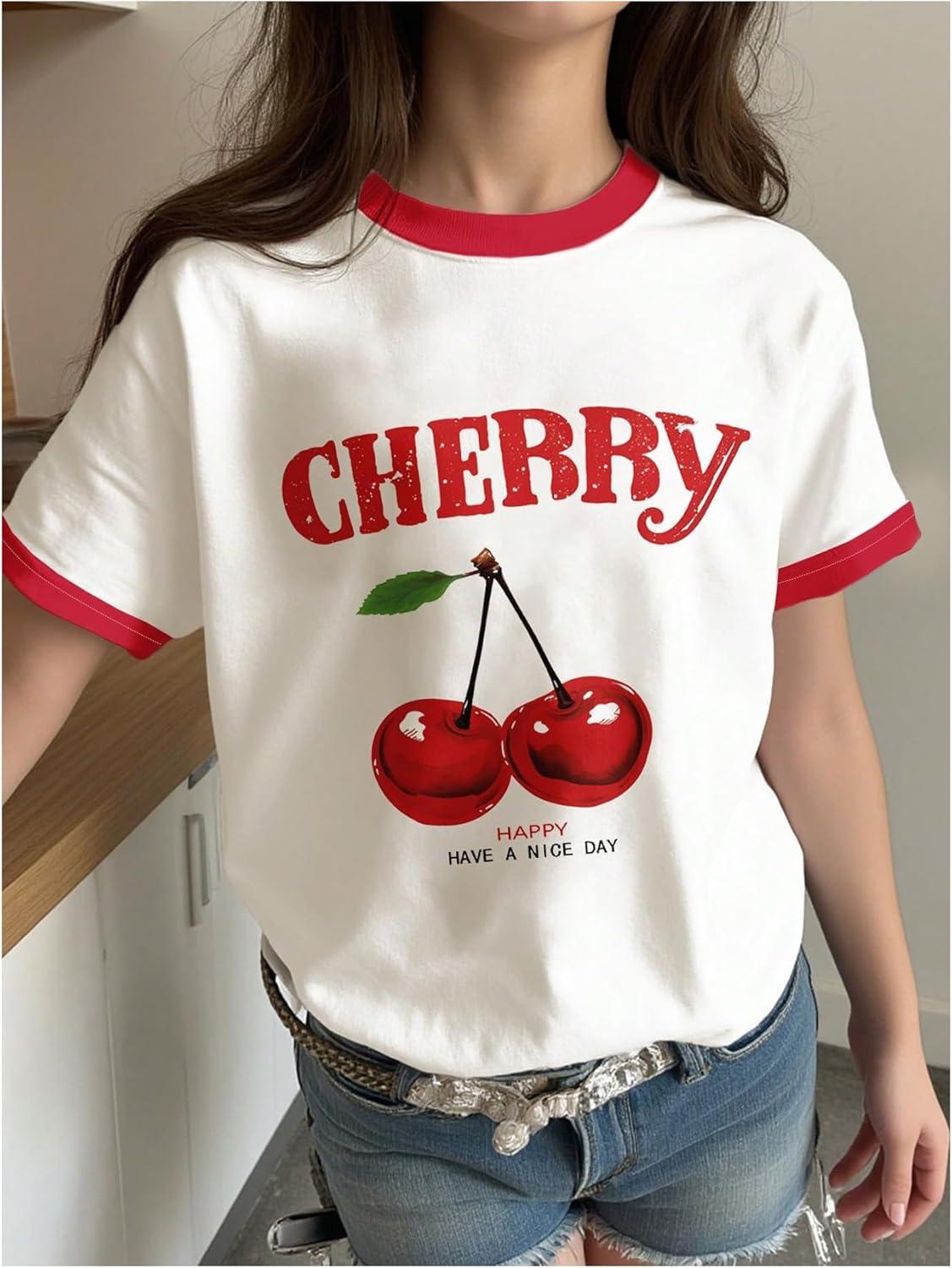 Girls Cherry Shirt Short Sleeve Colorblock Graphic Tees Cute Summer Shirts Y2k Aesthetic Clothes(White)
