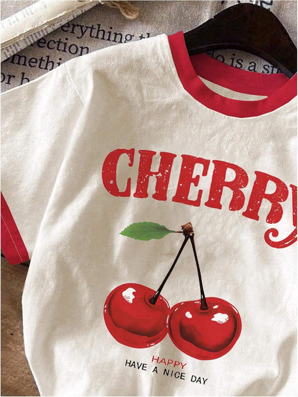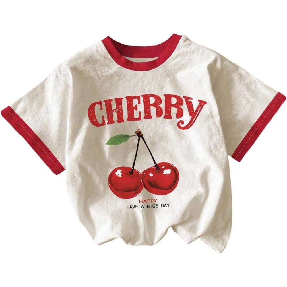 Girls Cherry Shirt Short Sleeve Colorblock Graphic Tees Cute Summer Shirts Y2k Aesthetic Clothes(Apricot)