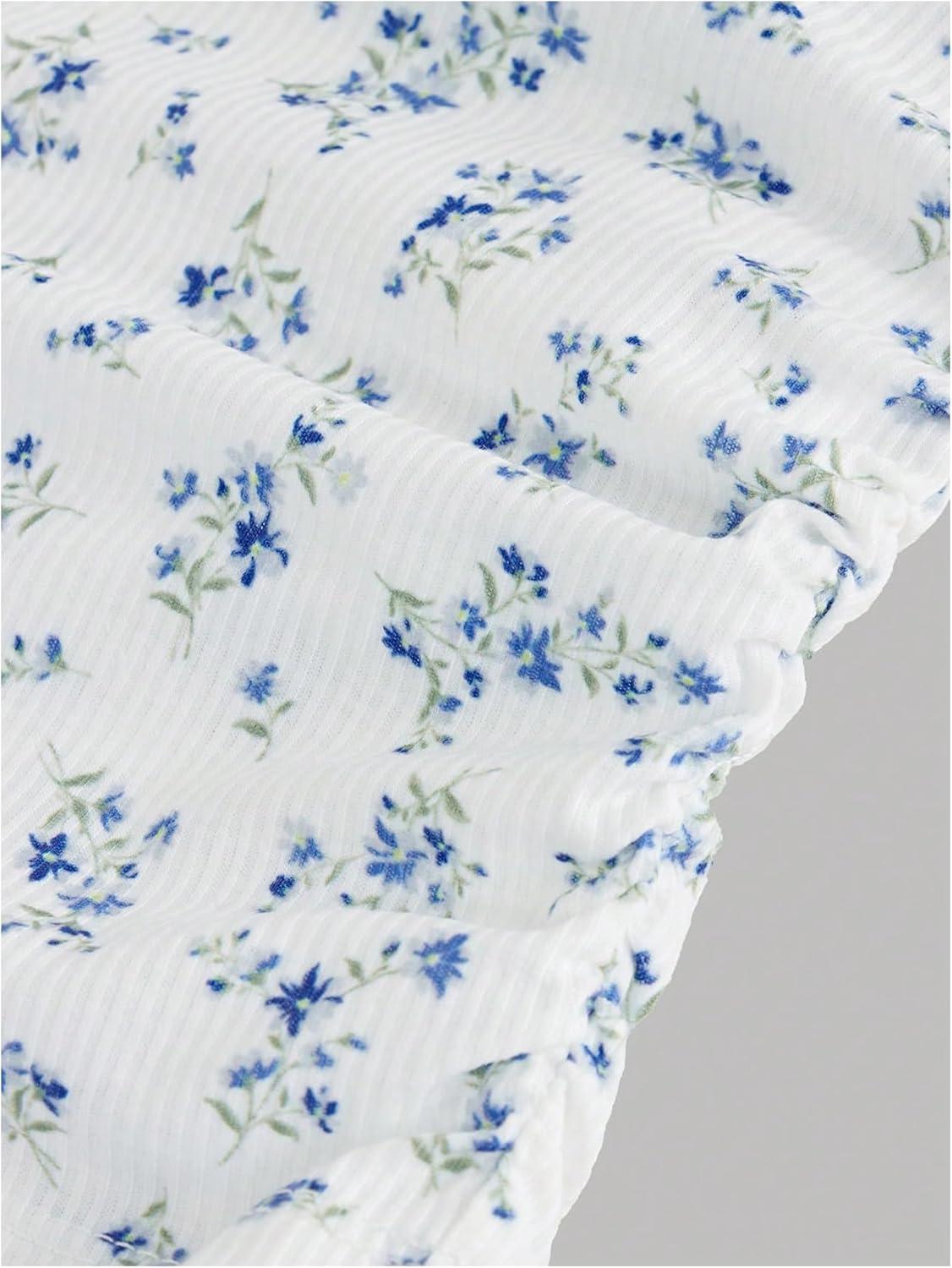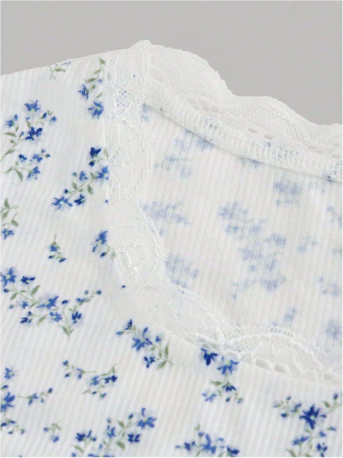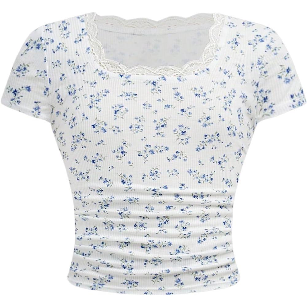Girl's Ditsy Floral Print Lace T Shirt Short Sleeve Ribbed Ruched Cute Tee Shirts Summer Tops(Blue)