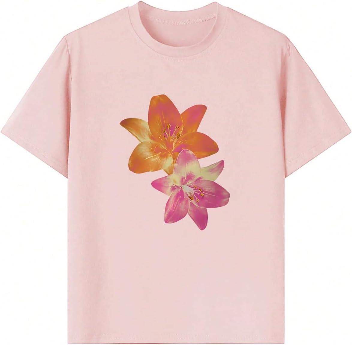 imageGirls Floral Graphic Tees Short Sleeve Loose Summer Shirts for Girls Aesthetic Cute Clothes TrendyPink