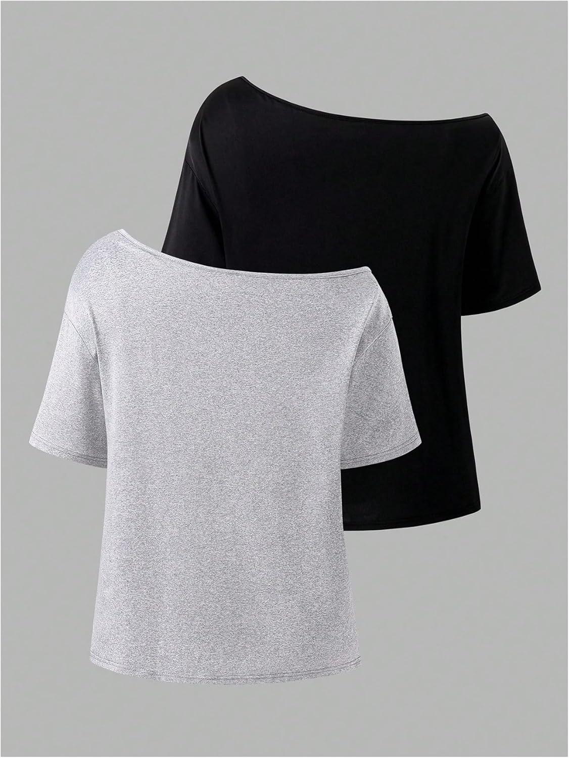 Girl’s Off The Shoulder Tops Short Sleeve Cute Summer T Shirts for Teens Girls Y2k Tops Trendy(Black and Grey)