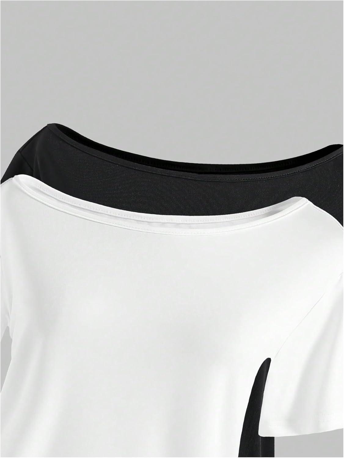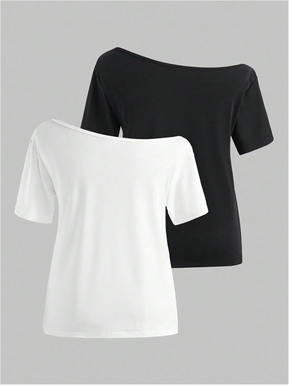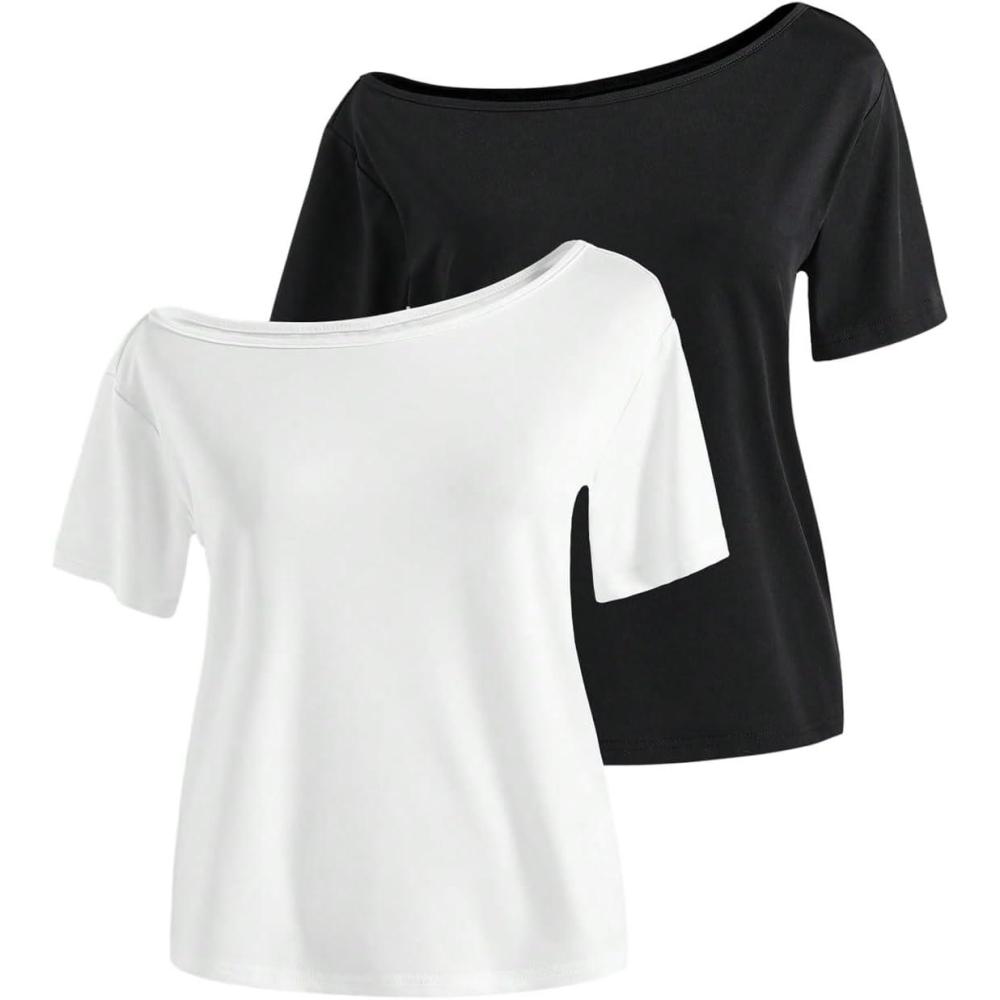imageGirls Off The Shoulder Tops Short Sleeve Cute Summer T Shirts for Teens Girls Y2k Tops TrendyBlack and White